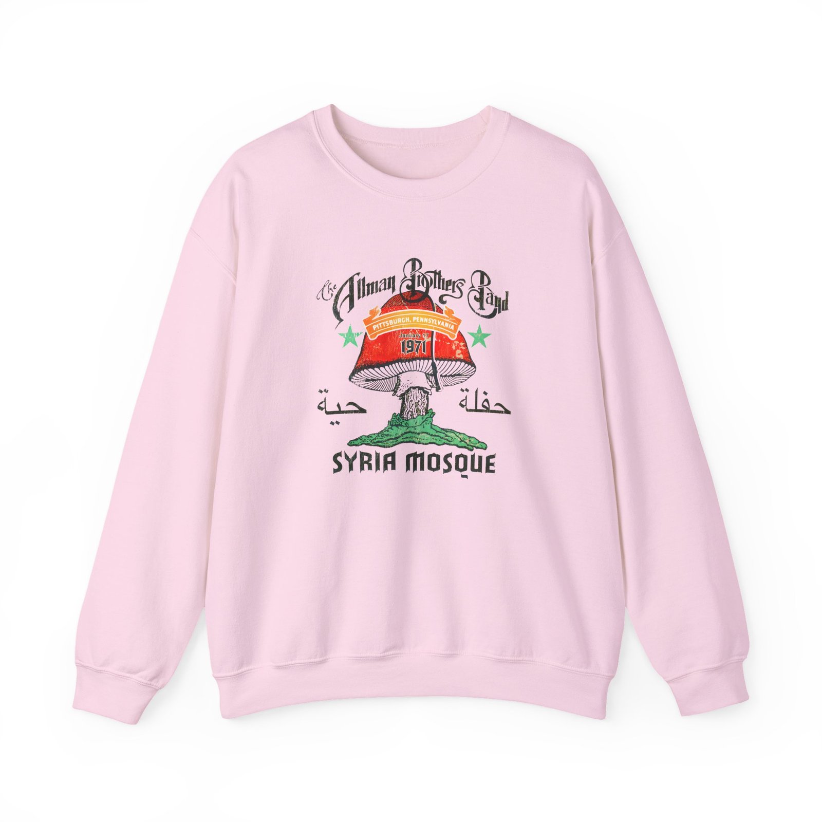 Ideal for any situation, The Allman Brothers Pittsburgh 1971 unisex heavy blend crewneck sweatshirt is pure comfort. These garments are made from polyester and cotton. This combination helps designs come out looking fresh and beautiful. The collar is ribbed knit, so it retains its shape even after washing. There are no itchy side seams on these sweaters.