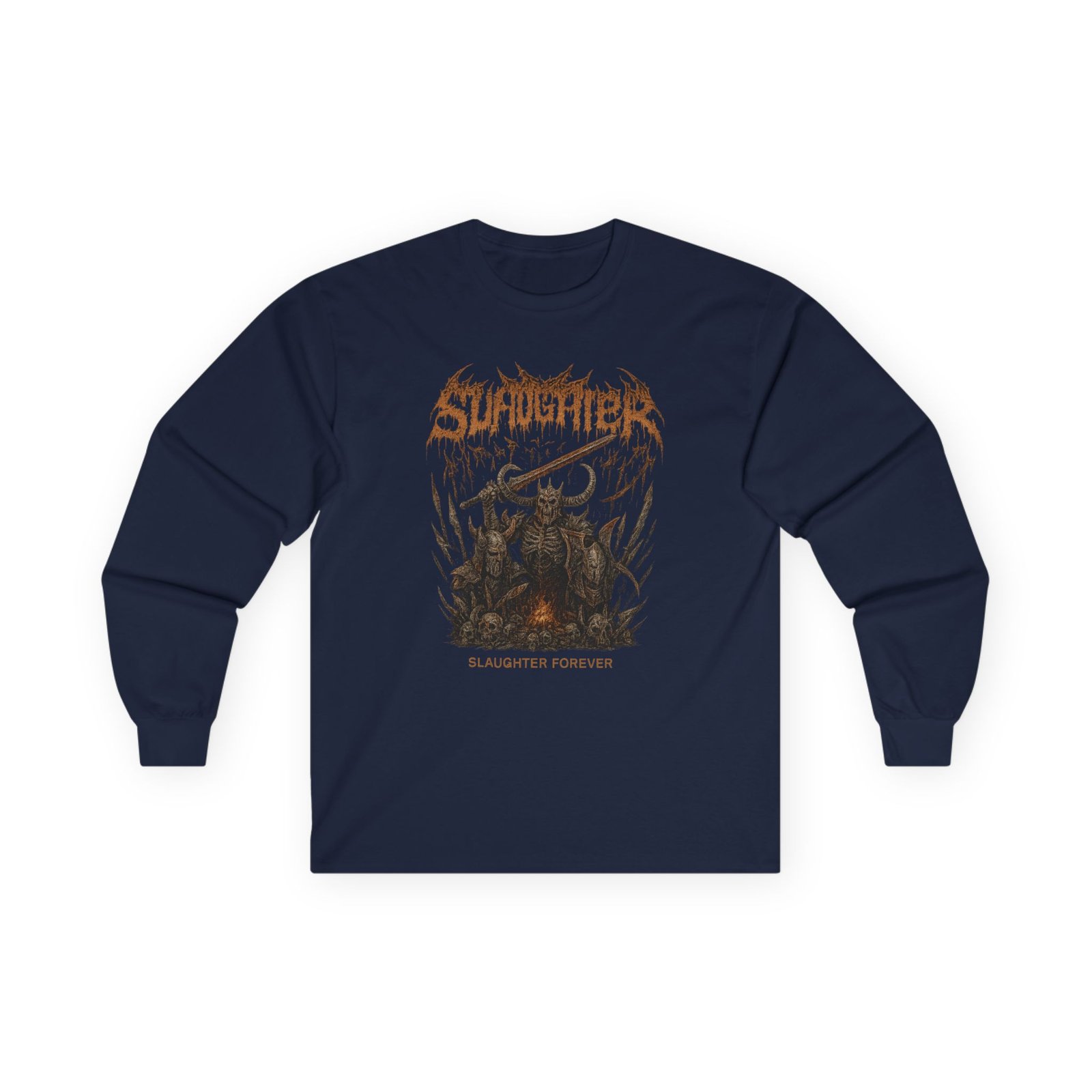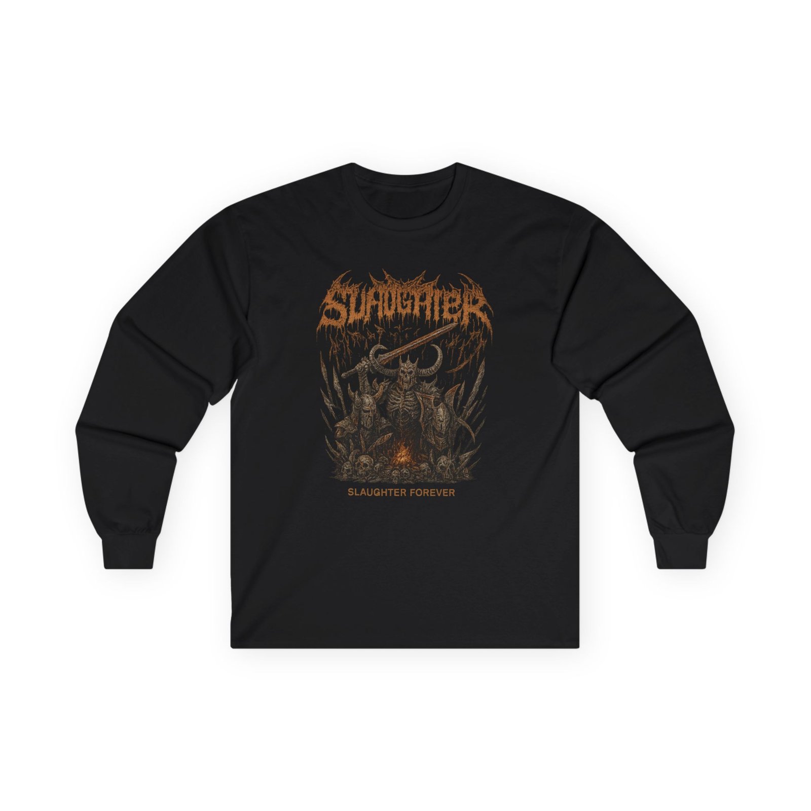 A bit more formal than a standard-issue t-shirt, To the Grave Slaughter Forever ultra cotton long sleeve tee is a clear comfort winner. The sleeves also act as a nice frame. There are no side seams. The shoulders are taped for improved durability. This makes for a good fitting around the shoulders and neck. The cotton used for these shirts is environmentally friendly.