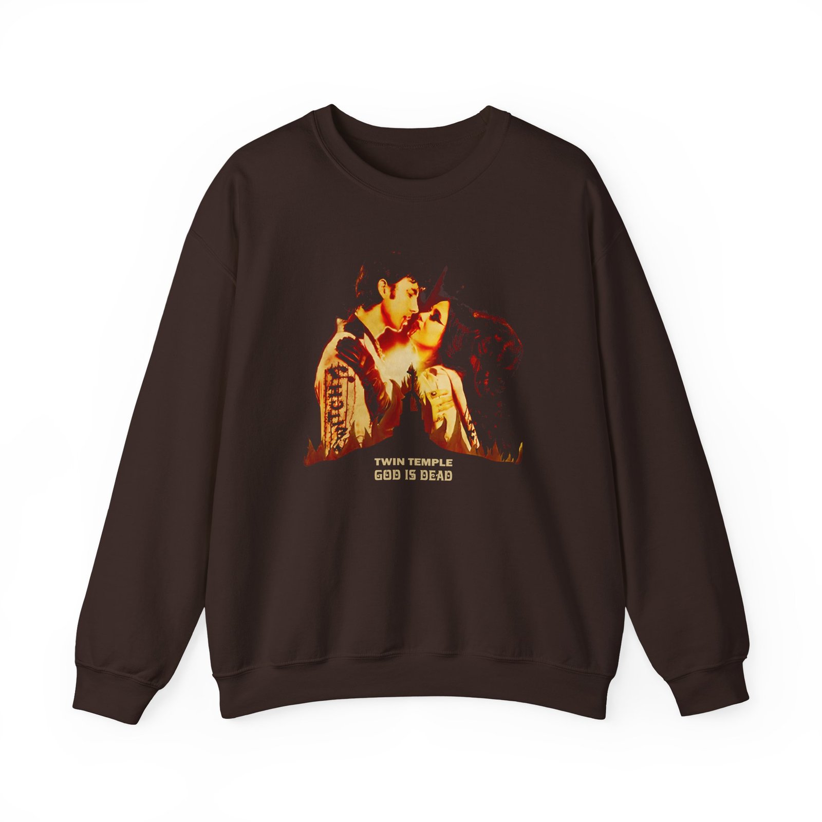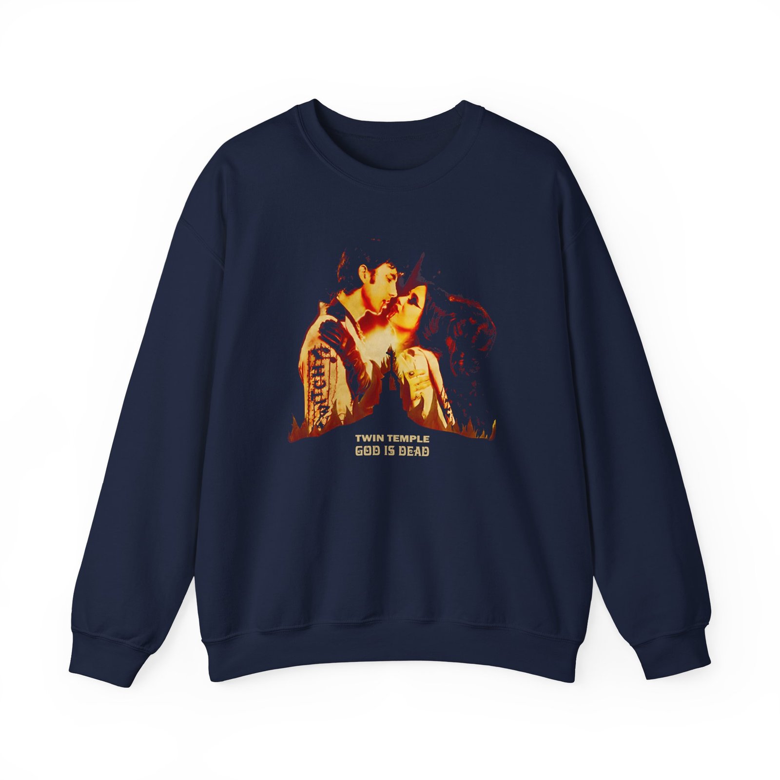 Ideal for any situation, a Twin Temple God is Dead Album Cover unisex heavy blend crewneck sweatshirt is pure comfort. These garments are made from polyester and cotton. This combination helps designs come out looking fresh and beautiful. The collar is ribbed knit, so it retains its shape even after washing. There are no itchy side seams on these sweaters.