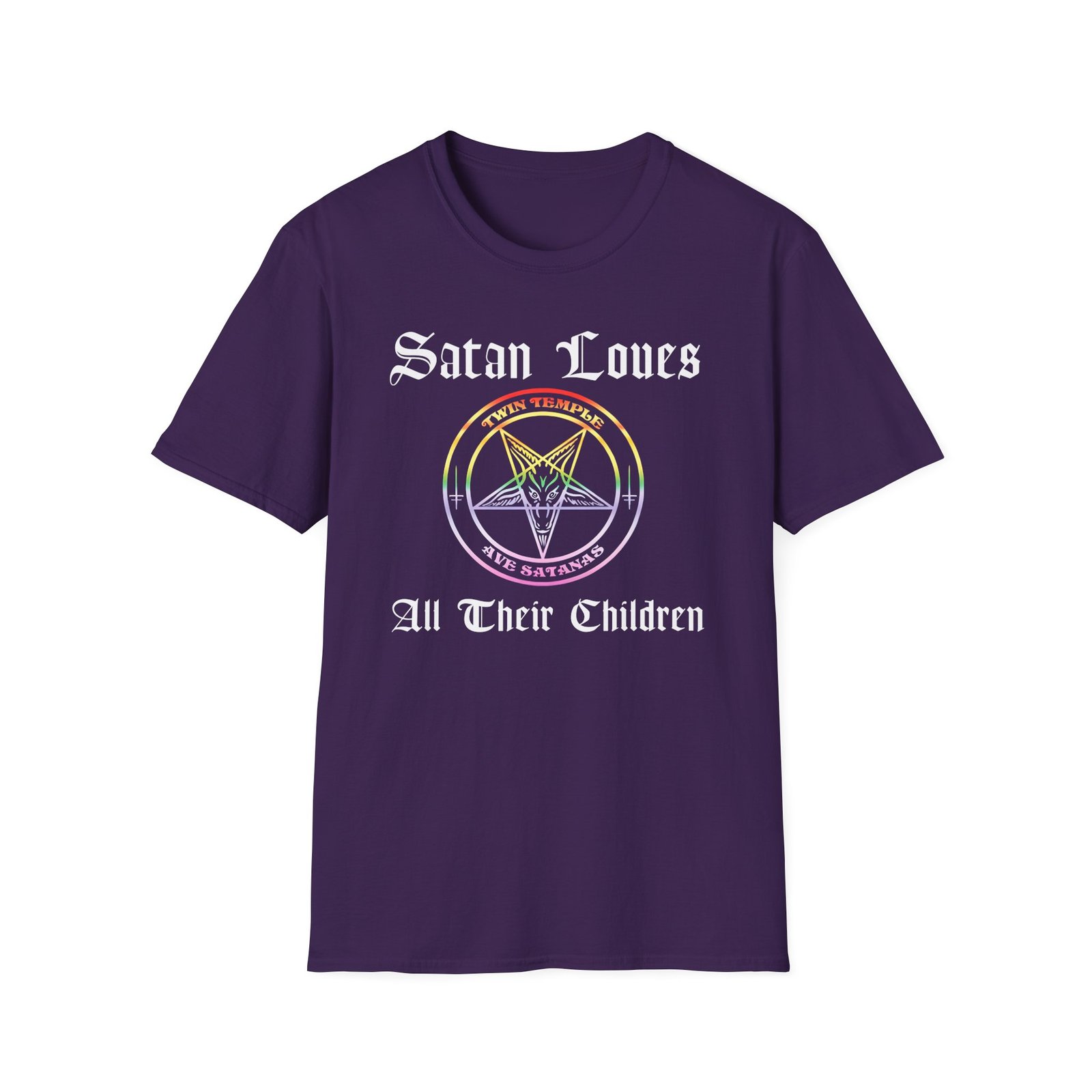 The Twin Temple Satan Loves All Their Children unisex soft-style t-shirt puts a new spin on casual comfort. Made from very soft materials, this tee is 100% cotton for solid colors. Heather colors and sports grey include polyester. The shoulders have twill tape for improved durability. There are no side seams. The collar is made with ribbed knitting to prevent curling damage.