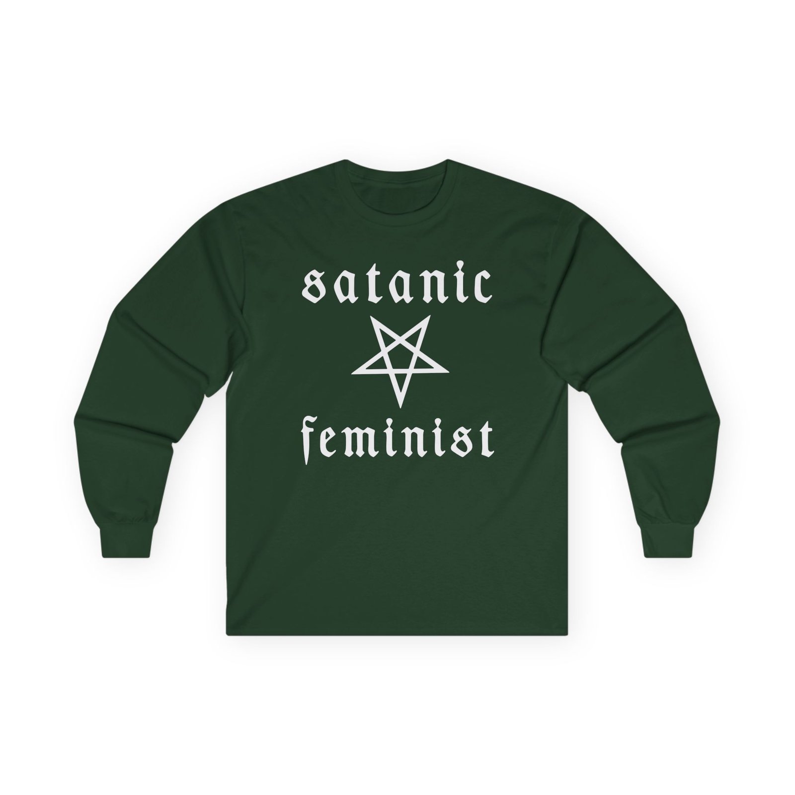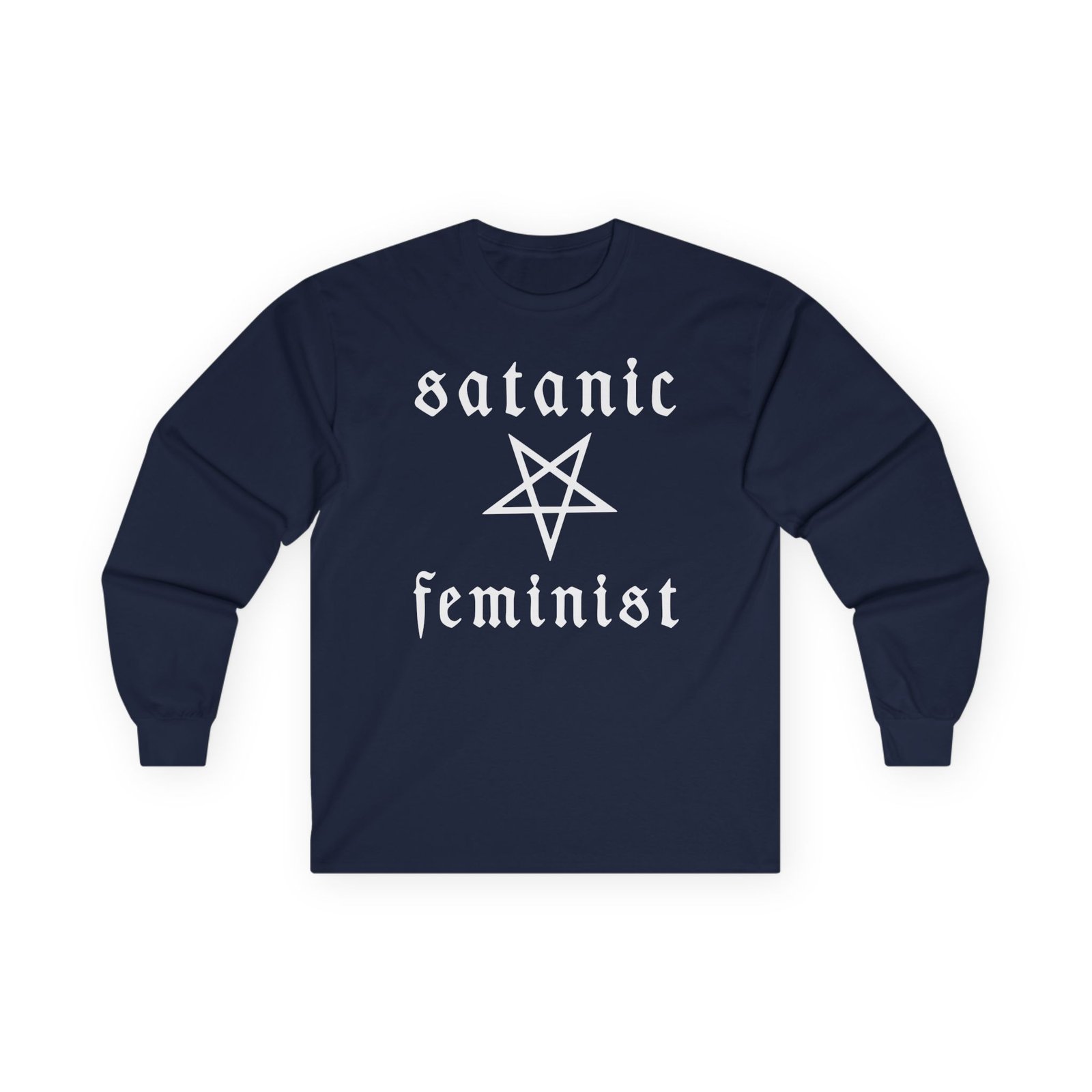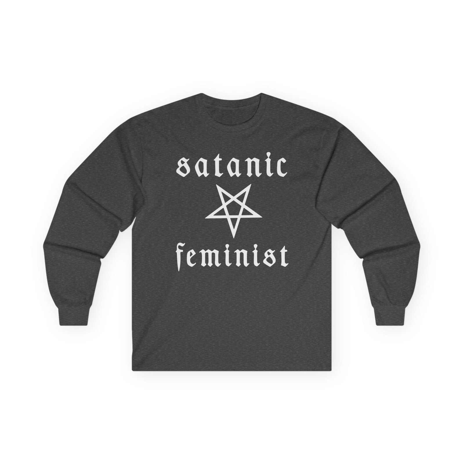A bit more formal than a standard-issue t-shirt, the Twin Temple Satanic Feminist ultra cotton long sleeve tee is a clear comfort winner. The sleeves also act as a nice frame. There are no side seams. The shoulders are taped for improved durability. This makes for a good fitting around the shoulders and neck. The cotton used for these shirts is environmentally friendly.