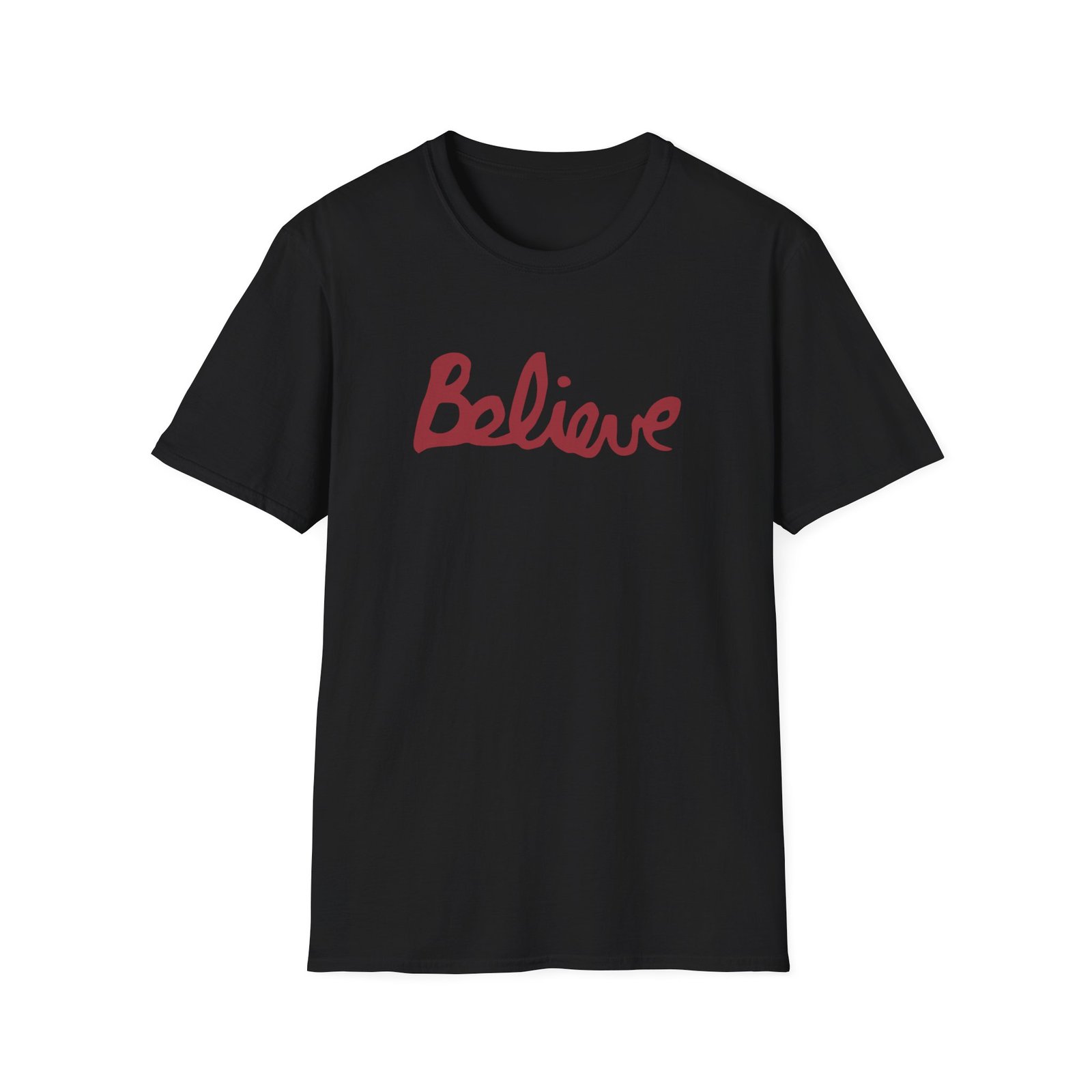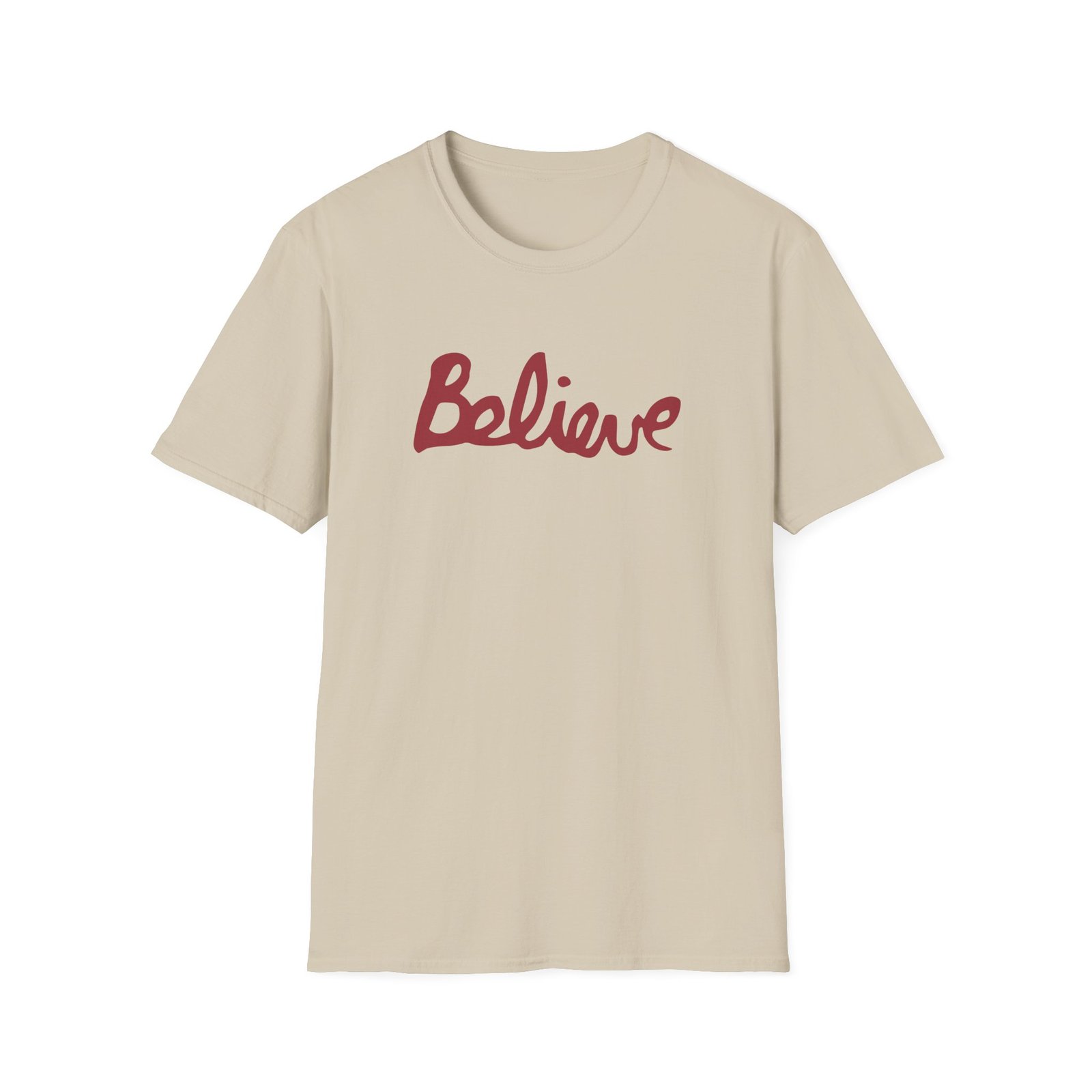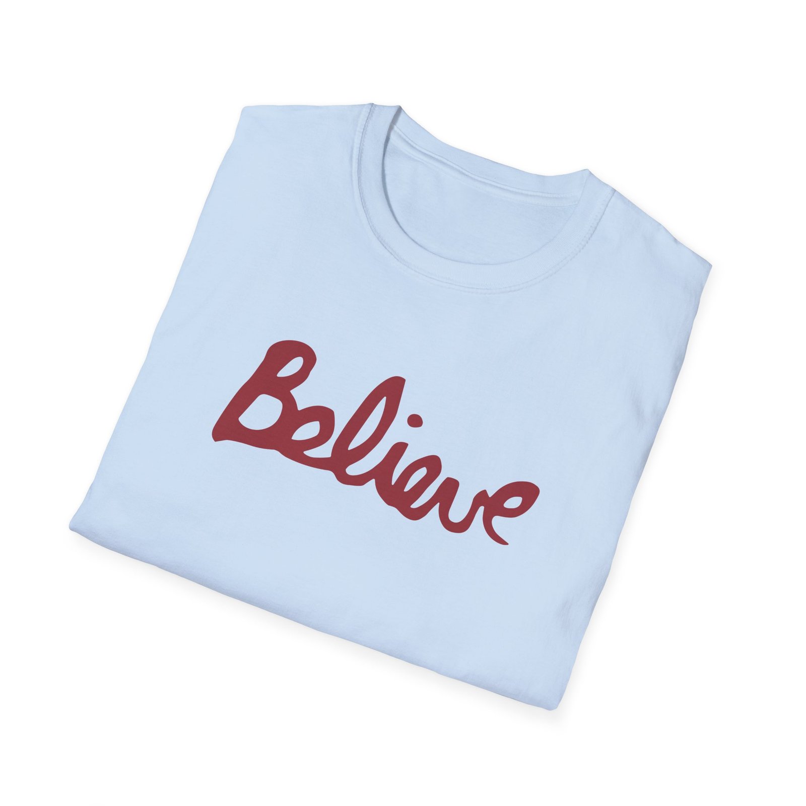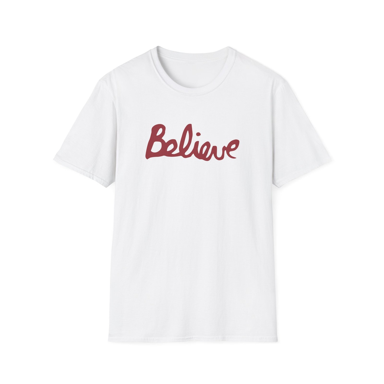 The Valencia Believe Cursive unisex soft-style t-shirt puts a new spin on casual comfort. Made from very soft materials, this tee is 100% cotton for solid colors. Heather colors and sports grey include polyester. The shoulders have twill tape for improved durability. There are no side seams. The collar is made with ribbed knitting to prevent curling damage.