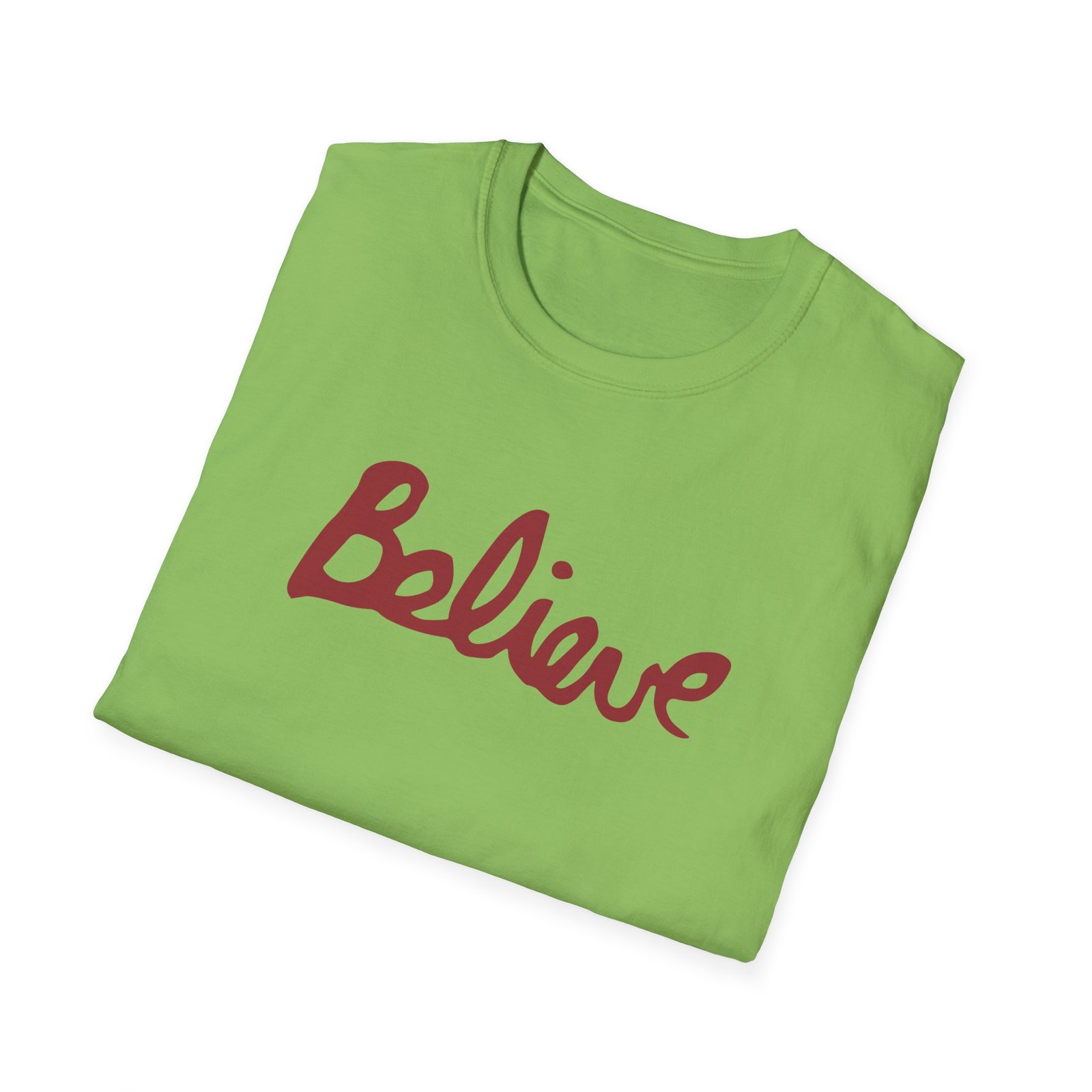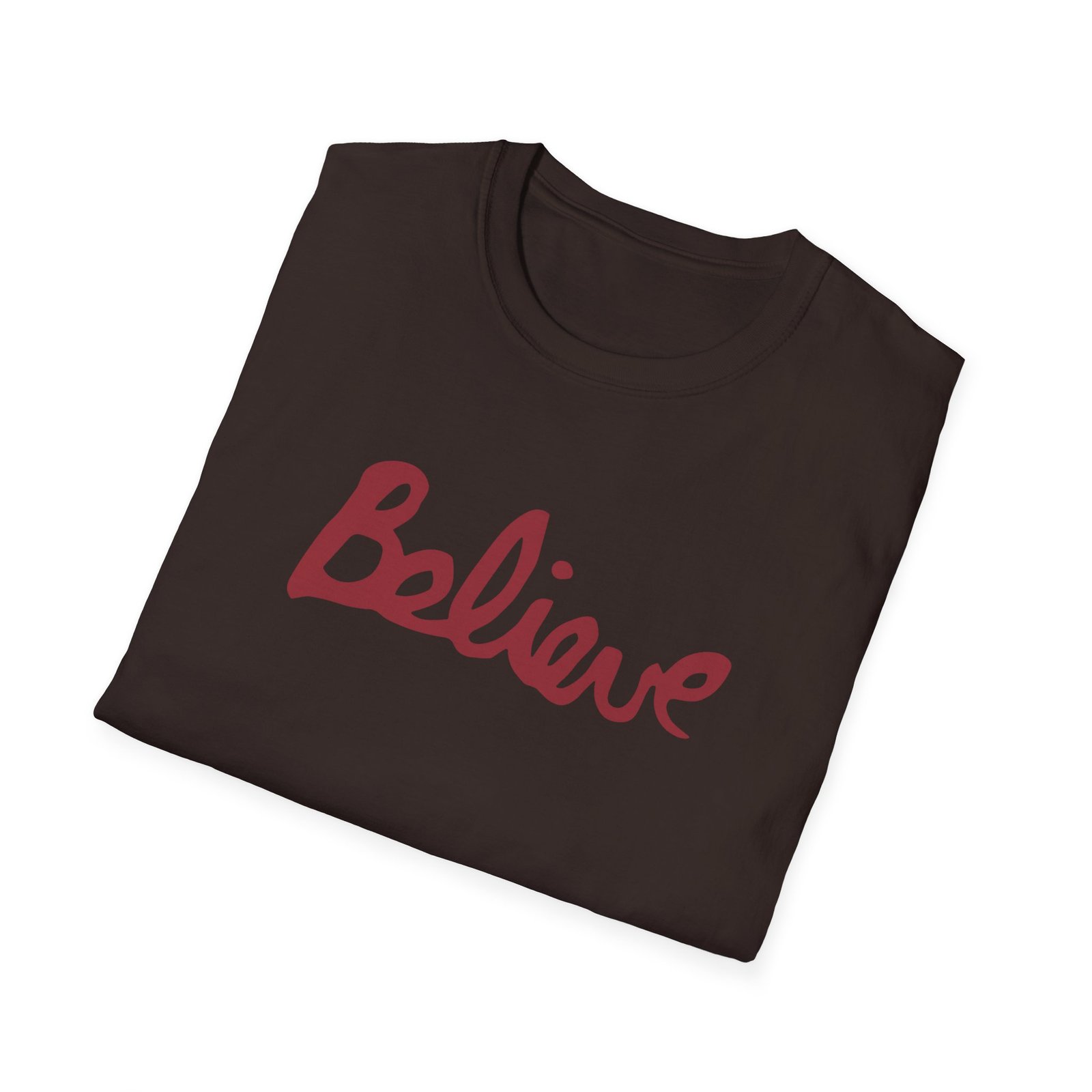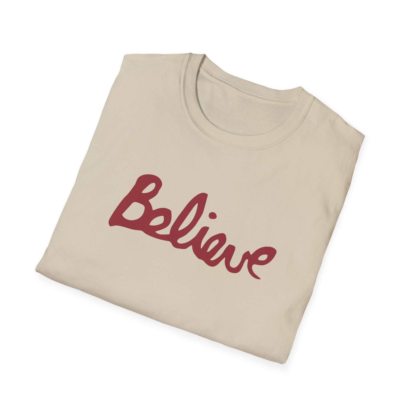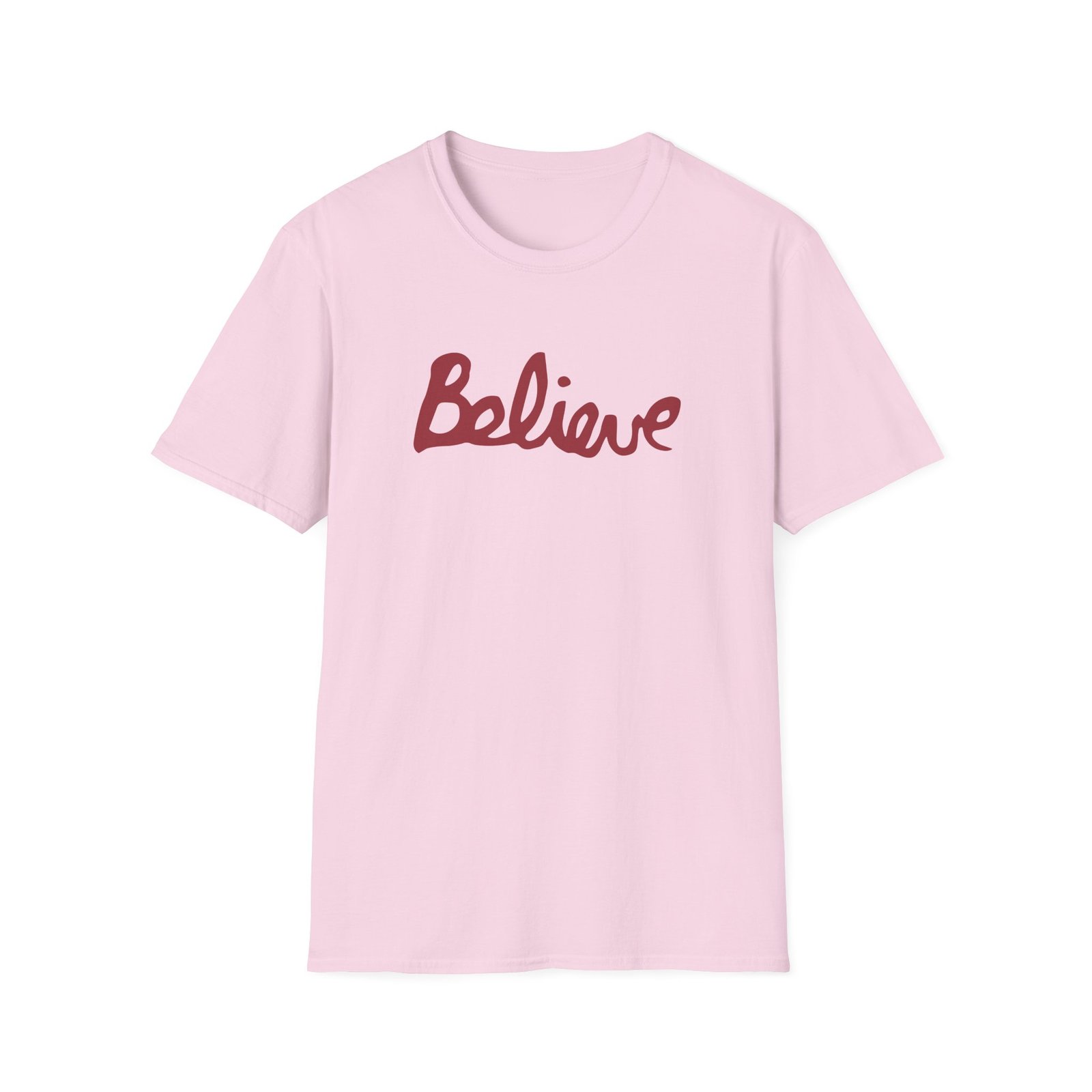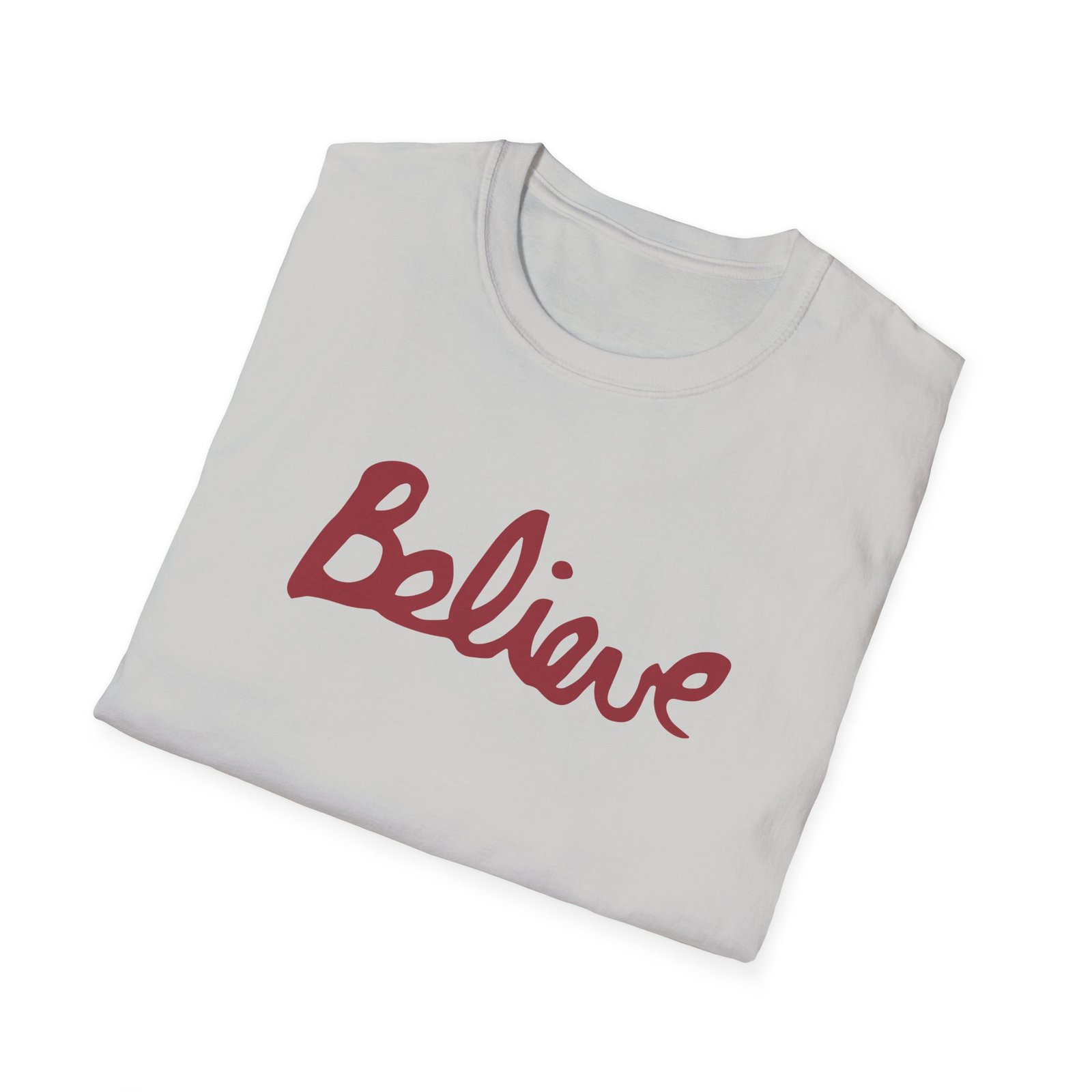 The Valencia Believe Cursive unisex soft-style t-shirt puts a new spin on casual comfort. Made from very soft materials, this tee is 100% cotton for solid colors. Heather colors and sports grey include polyester. The shoulders have twill tape for improved durability. There are no side seams. The collar is made with ribbed knitting to prevent curling damage.
