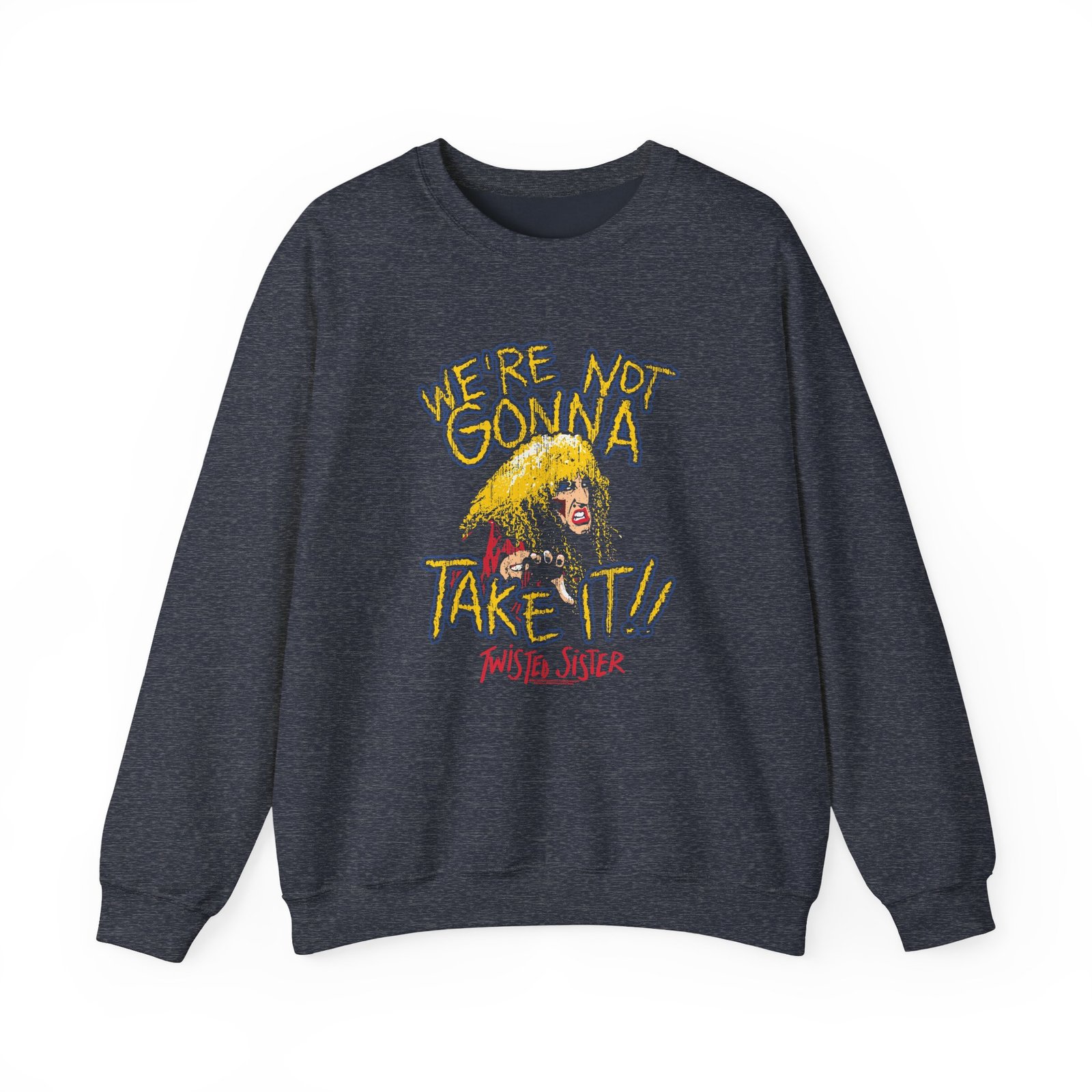 Ideal for any situation, a We're Not Gonna Take It Twisted Sister unisex heavy blend crewneck sweatshirt is pure comfort. These garments are made from polyester and cotton. This combination helps designs come out looking fresh and beautiful. The collar is ribbed knit, so it retains its shape even after washing. There are no itchy side seams on these sweaters.