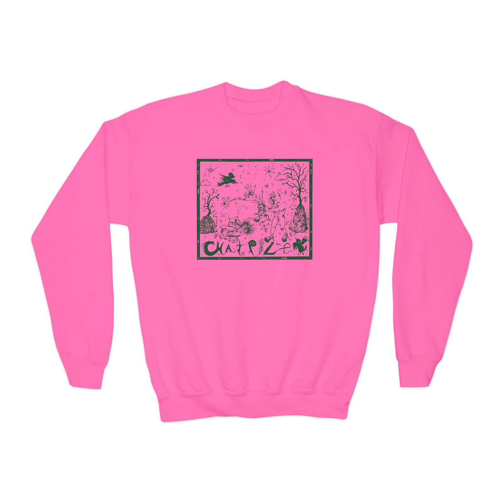 This loose-fit youth Chat Pile Olivia Gibb crewneck brings moody, occult-inspired style to everyday wear. A storm-lit silhouette and grainy, moonlit scene sit beneath hand-lettered gothic text in bruised purple — a look that reads like a midnight zine spread. The sweatshirt’s medium-heavy knit feels substantial without weighing down small frames, and the ribbed collar and cuffs hold their shape through play and repeat washes. Let this crew be the quiet centerpiece of a darker wardrobe: layered over band tees, hoodies, or under a denim jacket for a city-night vibe that leans mysterious and made-for-exploring.