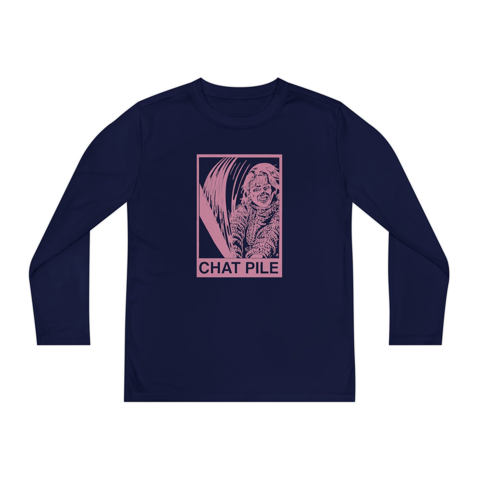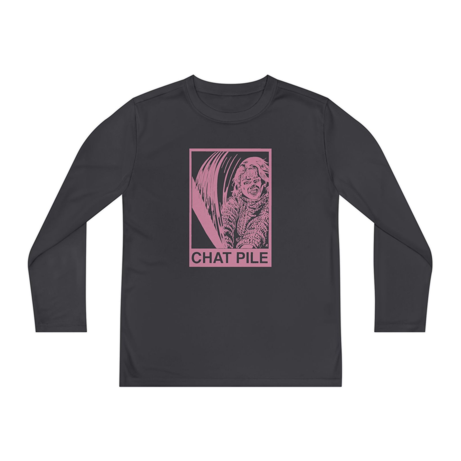 A lightweight Chat Pile Shame long-sleeve designed for active kids who lean into darker, atmospheric style. The shirt’s smooth, moisture-wicking polyester keeps movement unhindered and dries fast after practice or a day outside. The front art drops into a stormy, grayscale scene crowned by a jagged flash of lightning and moody gothic lettering — a bold, quietly rebellious statement that pairs with skate nights, band practice, or just hanging with friends. The athletic cut skims the body for an energetic silhouette, while the tear-away label keeps comfort high. Warmth is balanced with breathability, so it layers easily under a jacket or wears solo on cooler evenings.