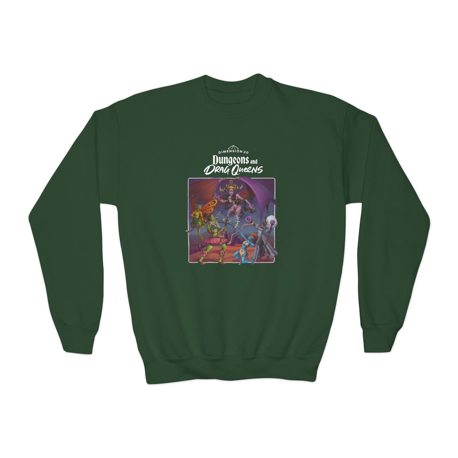 This loose-fit youth Dropout Dungeons and Drag Queens crewneck brings moody, occult-inspired style to everyday wear. A storm-lit silhouette and grainy, moonlit scene sit beneath hand-lettered gothic text in bruised purple — a look that reads like a midnight zine spread. The sweatshirt’s medium-heavy knit feels substantial without weighing down small frames, and the ribbed collar and cuffs hold their shape through play and repeat washes. Let this crew be the quiet centerpiece of a darker wardrobe: layered over band tees, hoodies, or under a denim jacket for a city-night vibe that leans mysterious and made-for-exploring.