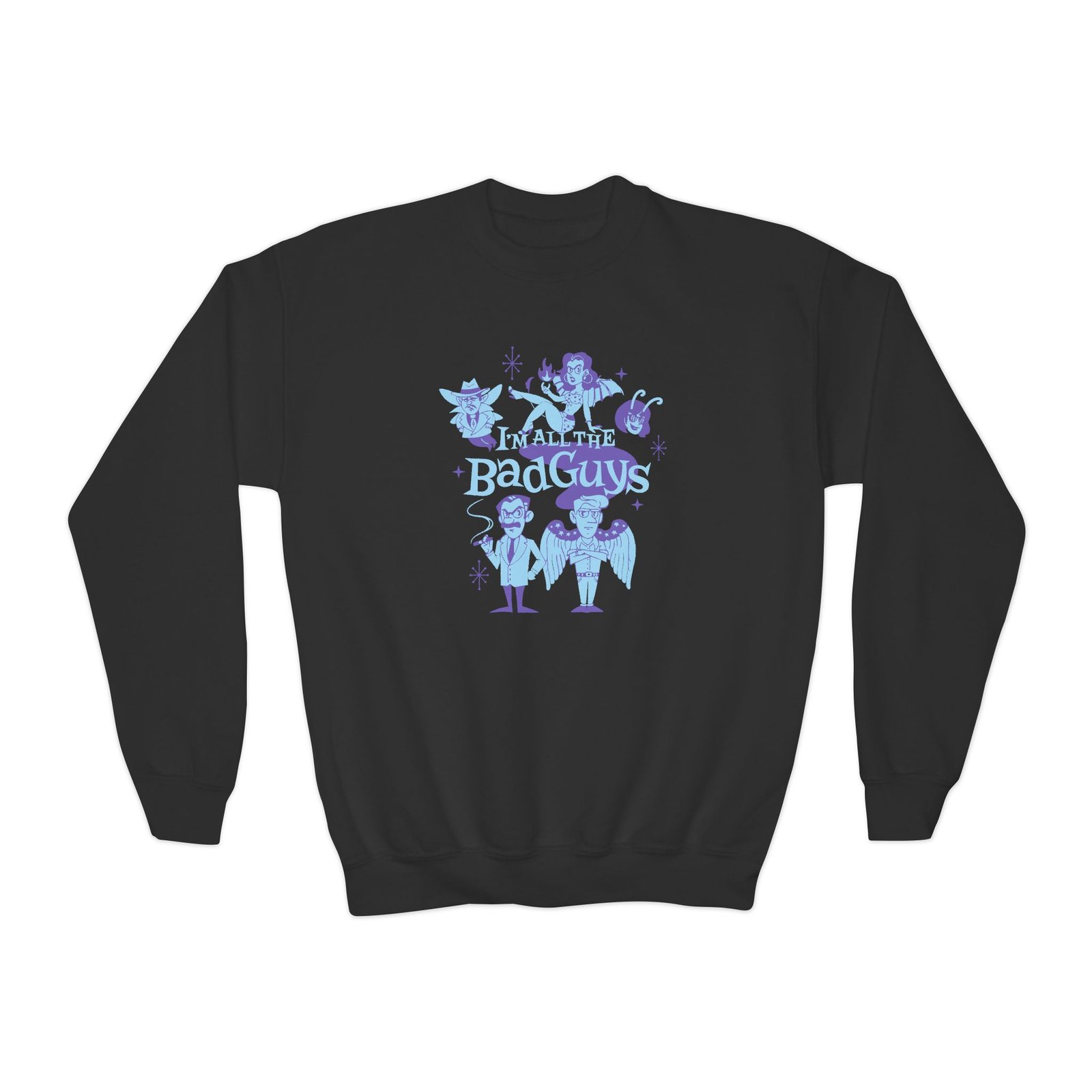 This loose-fit youth Dropout I'm All The Bad Guys crewneck brings moody, occult-inspired style to everyday wear. A storm-lit silhouette and grainy, moonlit scene sit beneath hand-lettered gothic text in bruised purple — a look that reads like a midnight zine spread. The sweatshirt’s medium-heavy knit feels substantial without weighing down small frames, and the ribbed collar and cuffs hold their shape through play and repeat washes. Let this crew be the quiet centerpiece of a darker wardrobe: layered over band tees, hoodies, or under a denim jacket for a city-night vibe that leans mysterious and made-for-exploring.
