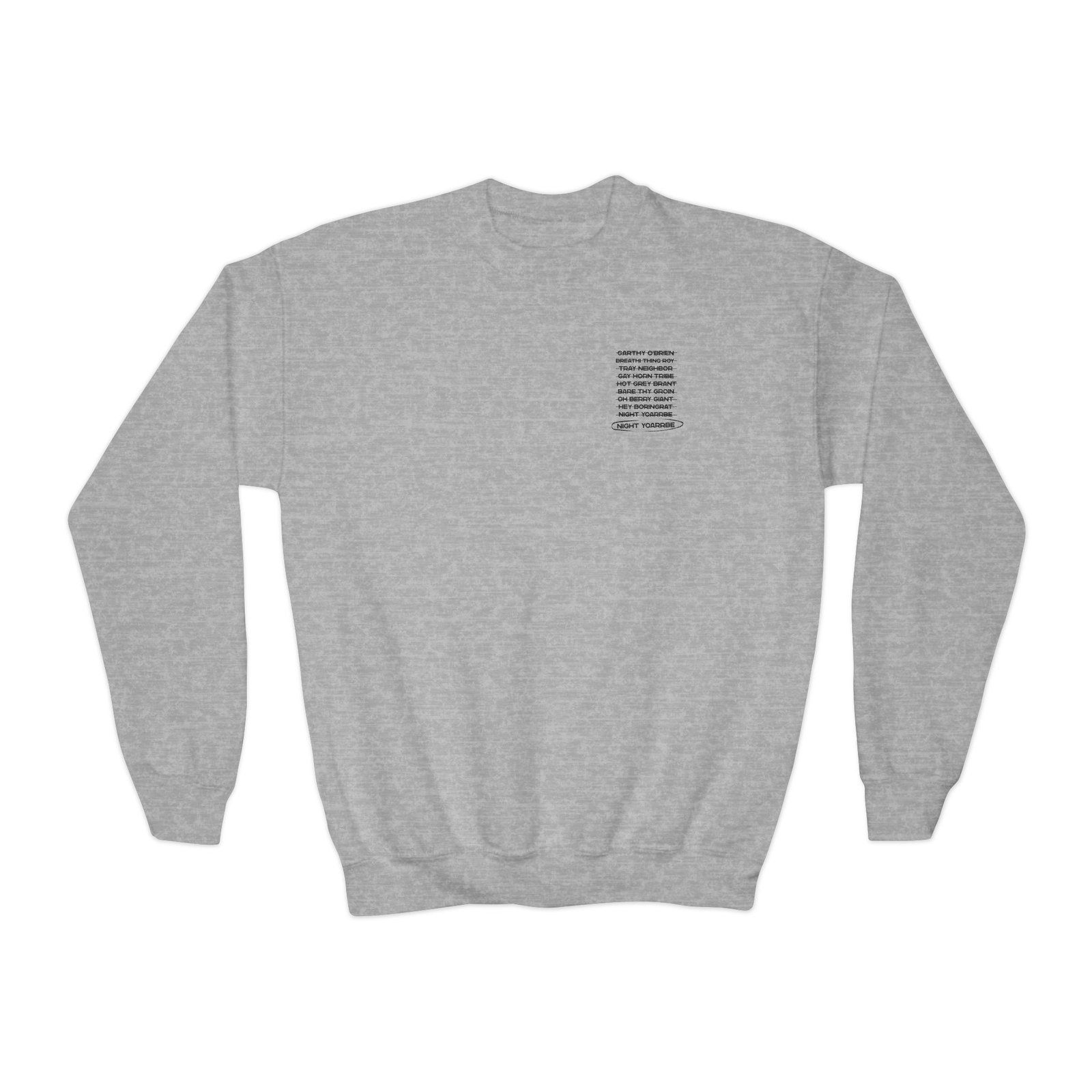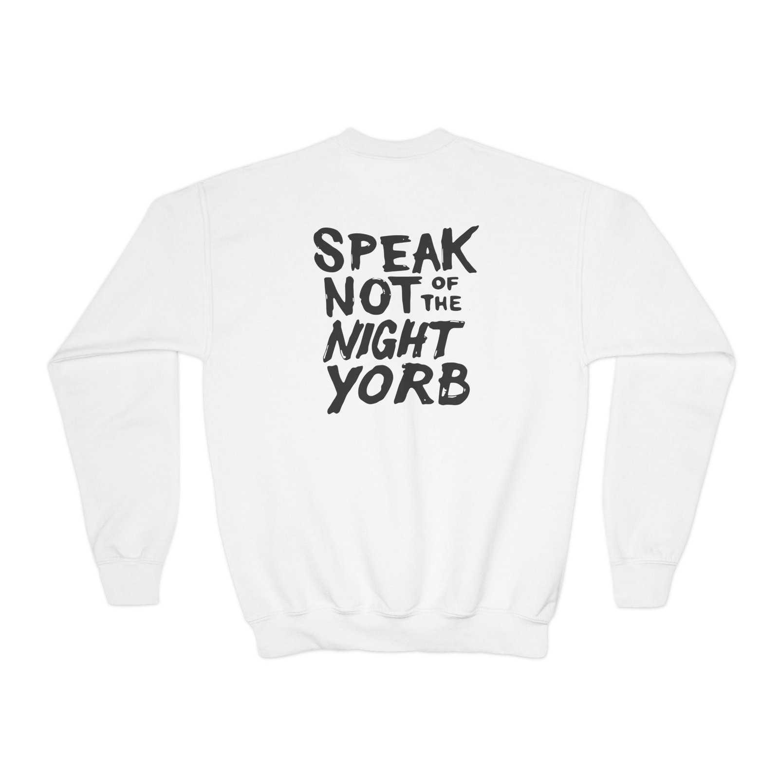 This loose-fit youth Dropout Night Yorb Anagram crewneck brings moody, occult-inspired style to everyday wear. A storm-lit silhouette and grainy, moonlit scene sit beneath hand-lettered gothic text in bruised purple — a look that reads like a midnight zine spread. The sweatshirt’s medium-heavy knit feels substantial without weighing down small frames, and the ribbed collar and cuffs hold their shape through play and repeat washes. Let this crew be the quiet centerpiece of a darker wardrobe: layered over band tees, hoodies, or under a denim jacket for a city-night vibe that leans mysterious and made-for-exploring.
