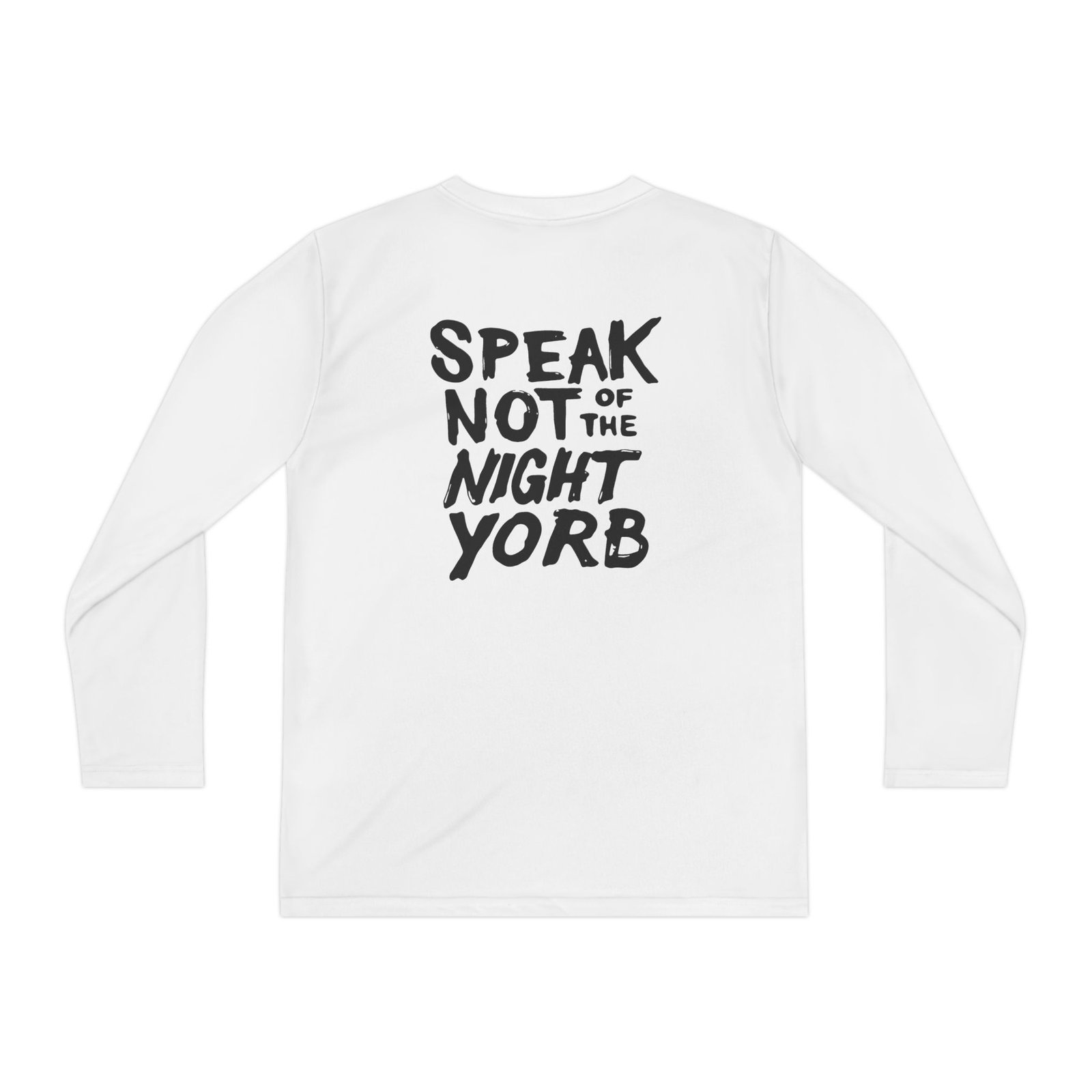 A lightweight Dropout Night Yorb Anagram long-sleeve designed for active kids who lean into darker, atmospheric style. The shirt’s smooth, moisture-wicking polyester keeps movement unhindered and dries fast after practice or a day outside. The front art drops into a stormy, grayscale scene crowned by a jagged flash of lightning and moody gothic lettering — a bold, quietly rebellious statement that pairs with skate nights, band practice, or just hanging with friends. The athletic cut skims the body for an energetic silhouette, while the tear-away label keeps comfort high. Warmth is balanced with breathability, so it layers easily under a jacket or wears solo on cooler evenings.