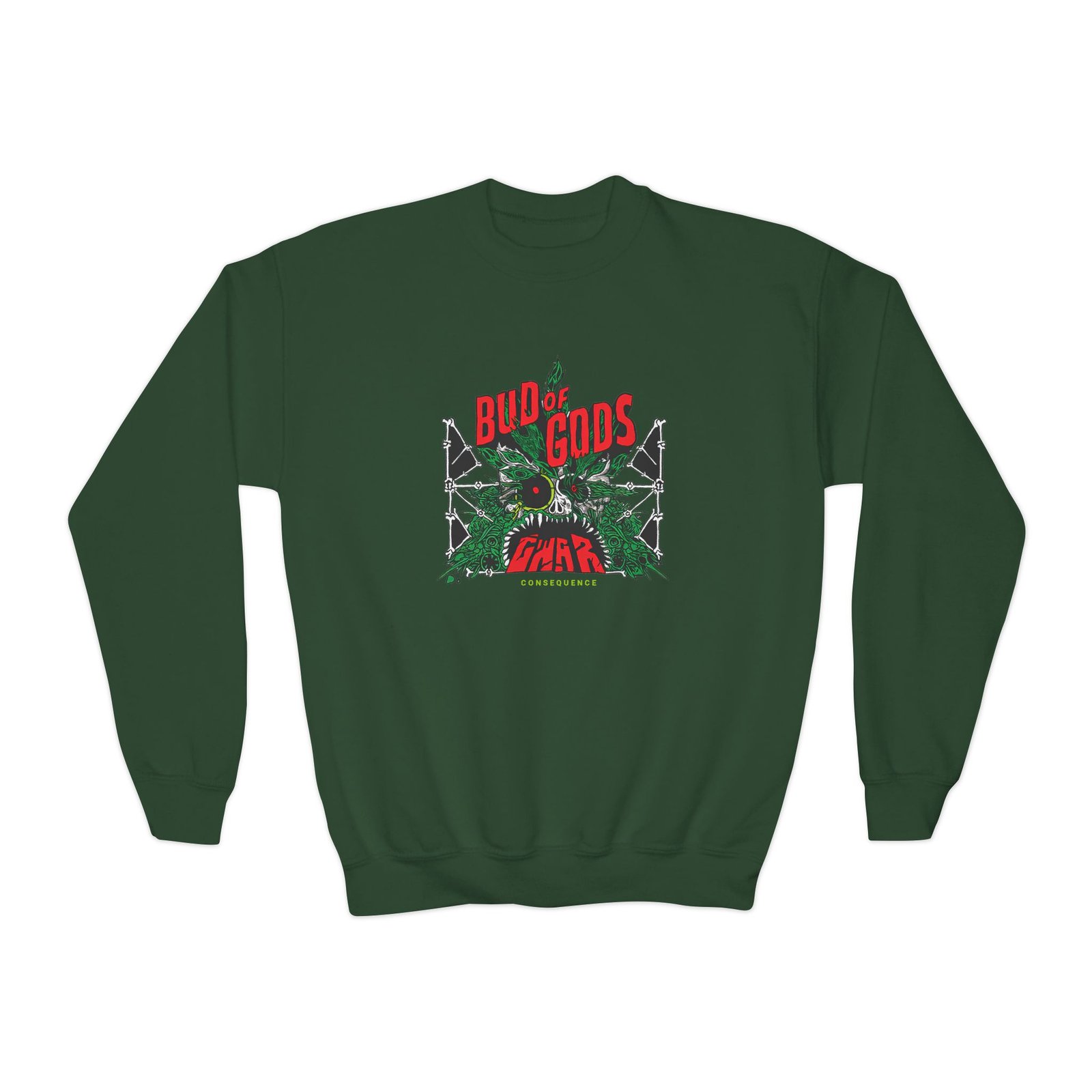 This loose-fit youth Gwar crewneck brings moody, occult-inspired style to everyday wear. A storm-lit silhouette and grainy, moonlit scene sit beneath hand-lettered gothic text in bruised purple — a look that reads like a midnight zine spread. The sweatshirt’s medium-heavy knit feels substantial without weighing down small frames, and the ribbed collar and cuffs hold their shape through play and repeat washes. Let this crew be the quiet centerpiece of a darker wardrobe: layered over band tees, hoodies, or under a denim jacket for a city-night vibe that leans mysterious and made-for-exploring.