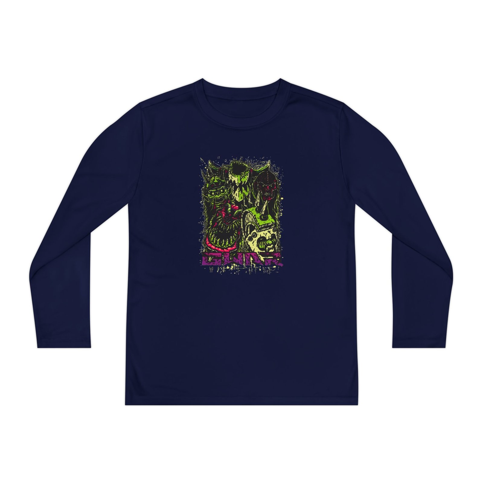 A lightweight Gwar Must Die long-sleeve designed for active kids who lean into darker, atmospheric style. The shirt’s smooth, moisture-wicking polyester keeps movement unhindered and dries fast after practice or a day outside. The front art drops into a stormy, grayscale scene crowned by a jagged flash of lightning and moody gothic lettering — a bold, quietly rebellious statement that pairs with skate nights, band practice, or just hanging with friends. The athletic cut skims the body for an energetic silhouette, while the tear-away label keeps comfort high. Warmth is balanced with breathability, so it layers easily under a jacket or wears solo on cooler evenings.