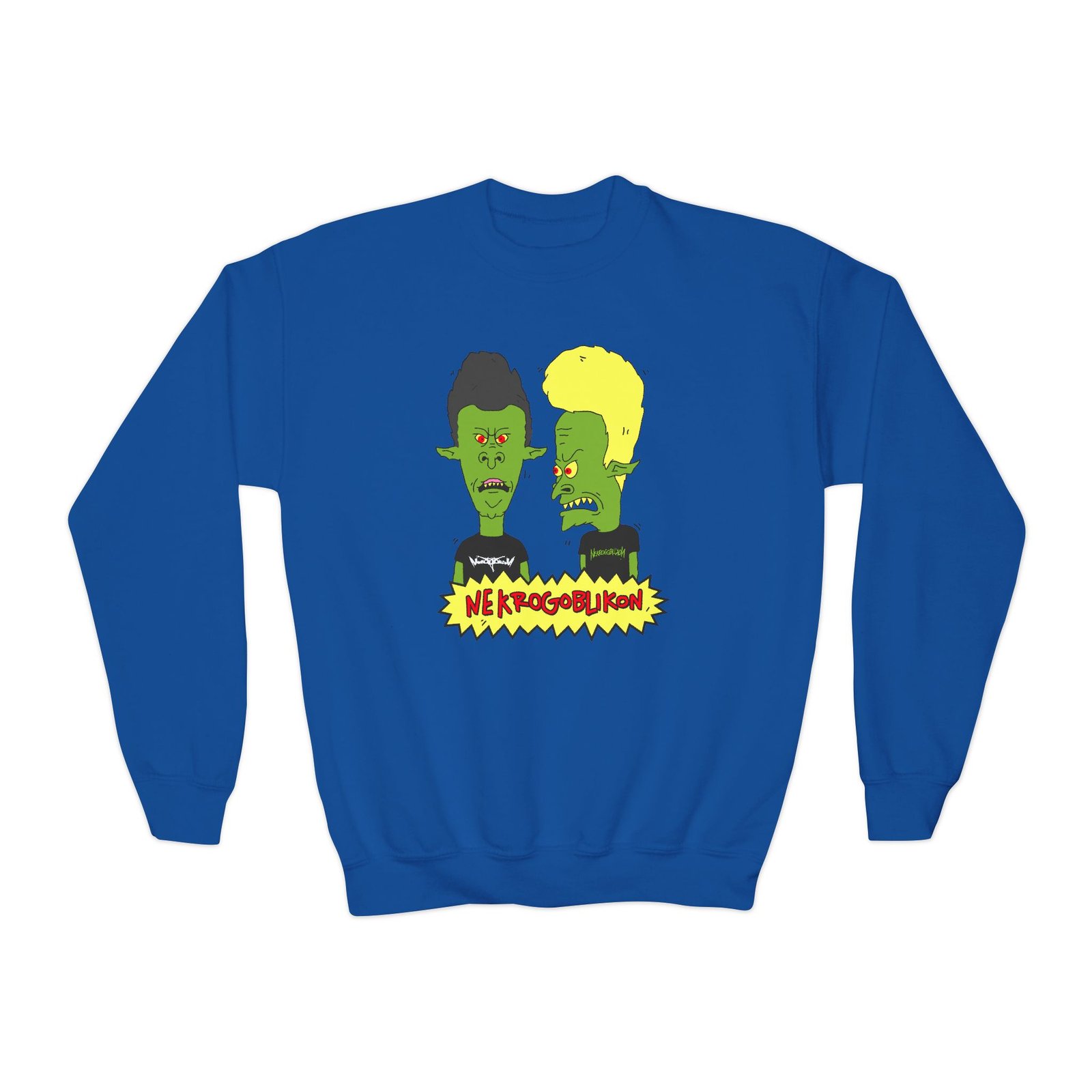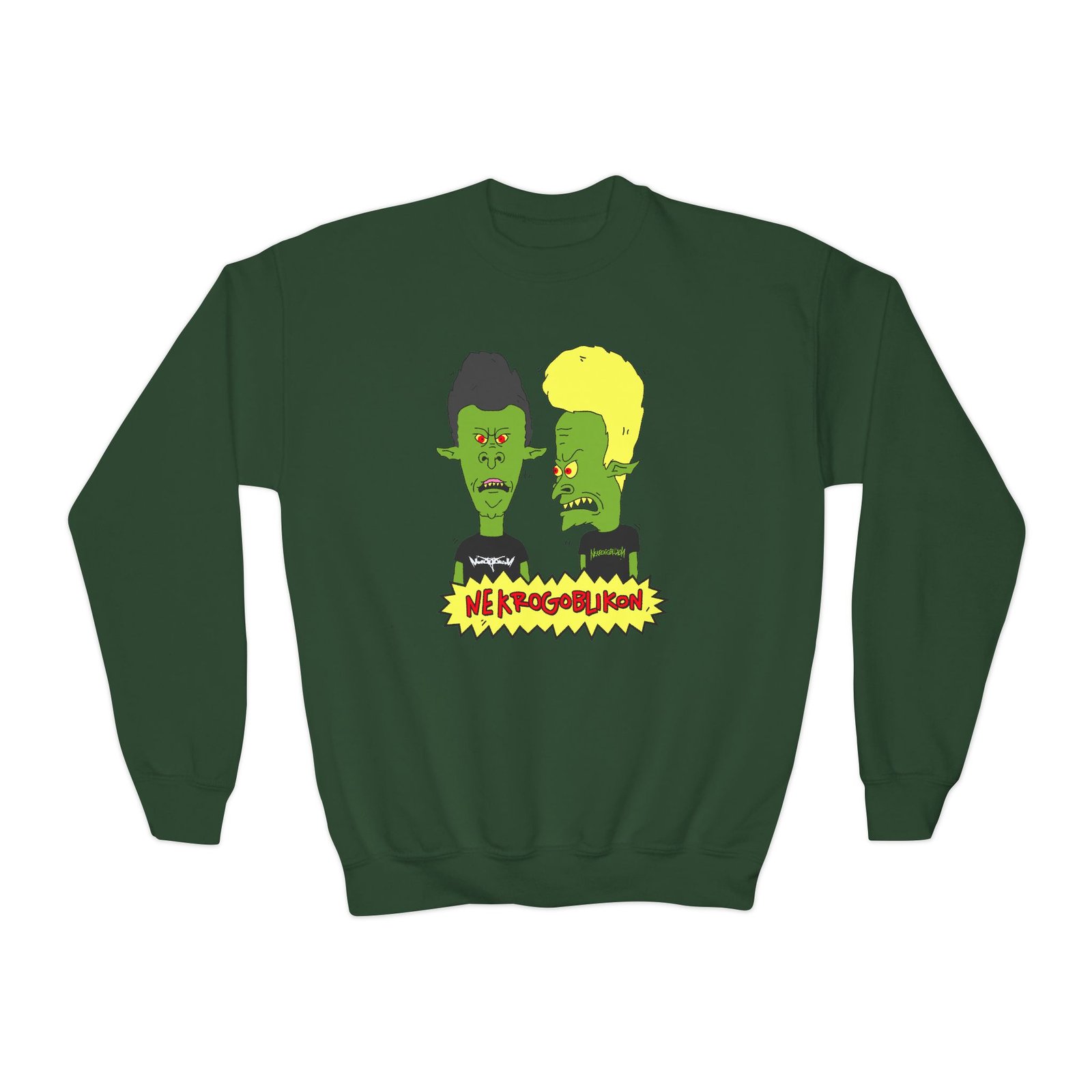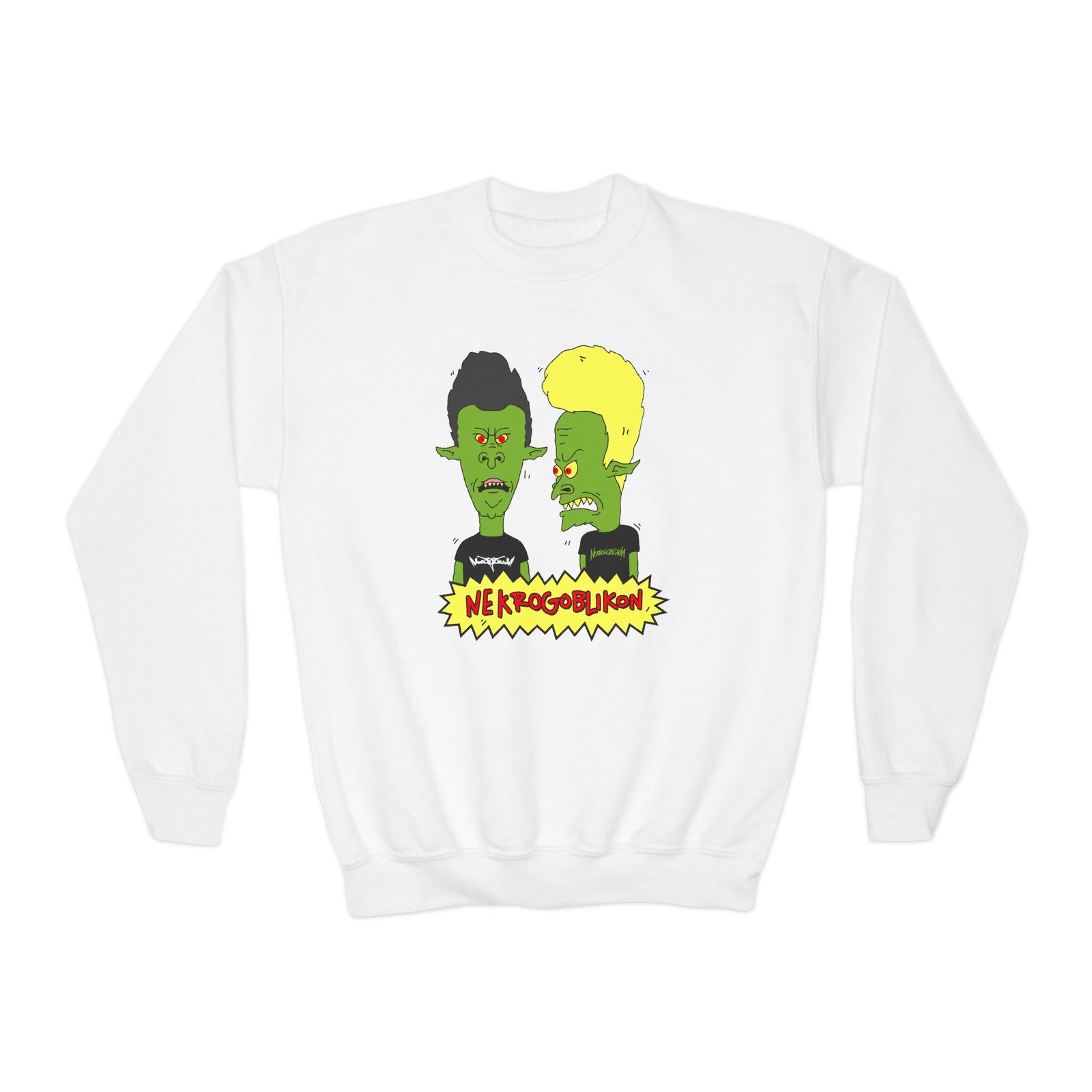 This loose-fit youth Nekrogoblikon crewneck brings moody, occult-inspired style to everyday wear. A storm-lit silhouette and grainy, moonlit scene sit beneath hand-lettered gothic text in bruised purple — a look that reads like a midnight zine spread. The sweatshirt’s medium-heavy knit feels substantial without weighing down small frames, and the ribbed collar and cuffs hold their shape through play and repeat washes. Let this crew be the quiet centerpiece of a darker wardrobe: layered over band tees, hoodies, or under a denim jacket for a city-night vibe that leans mysterious and made-for-exploring.