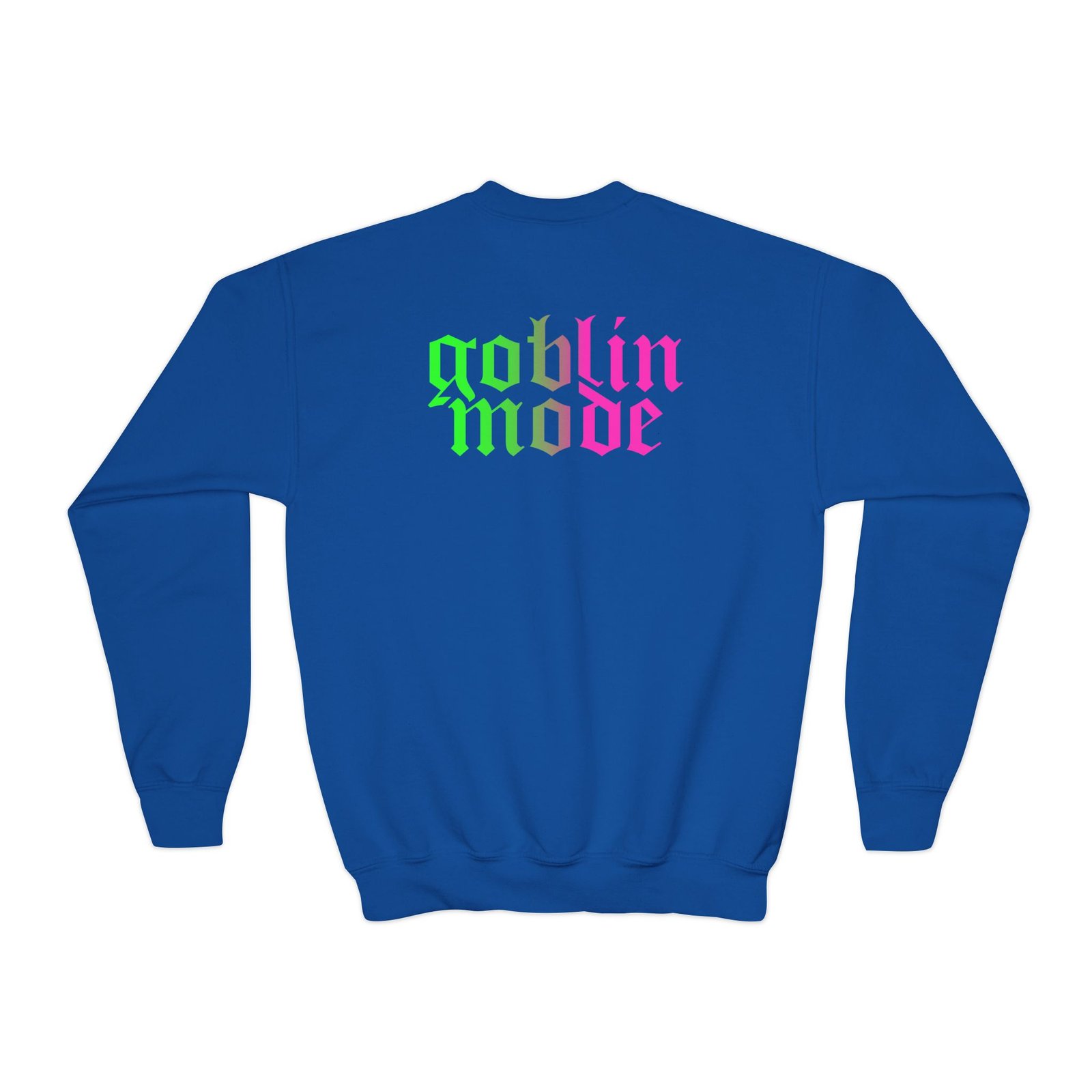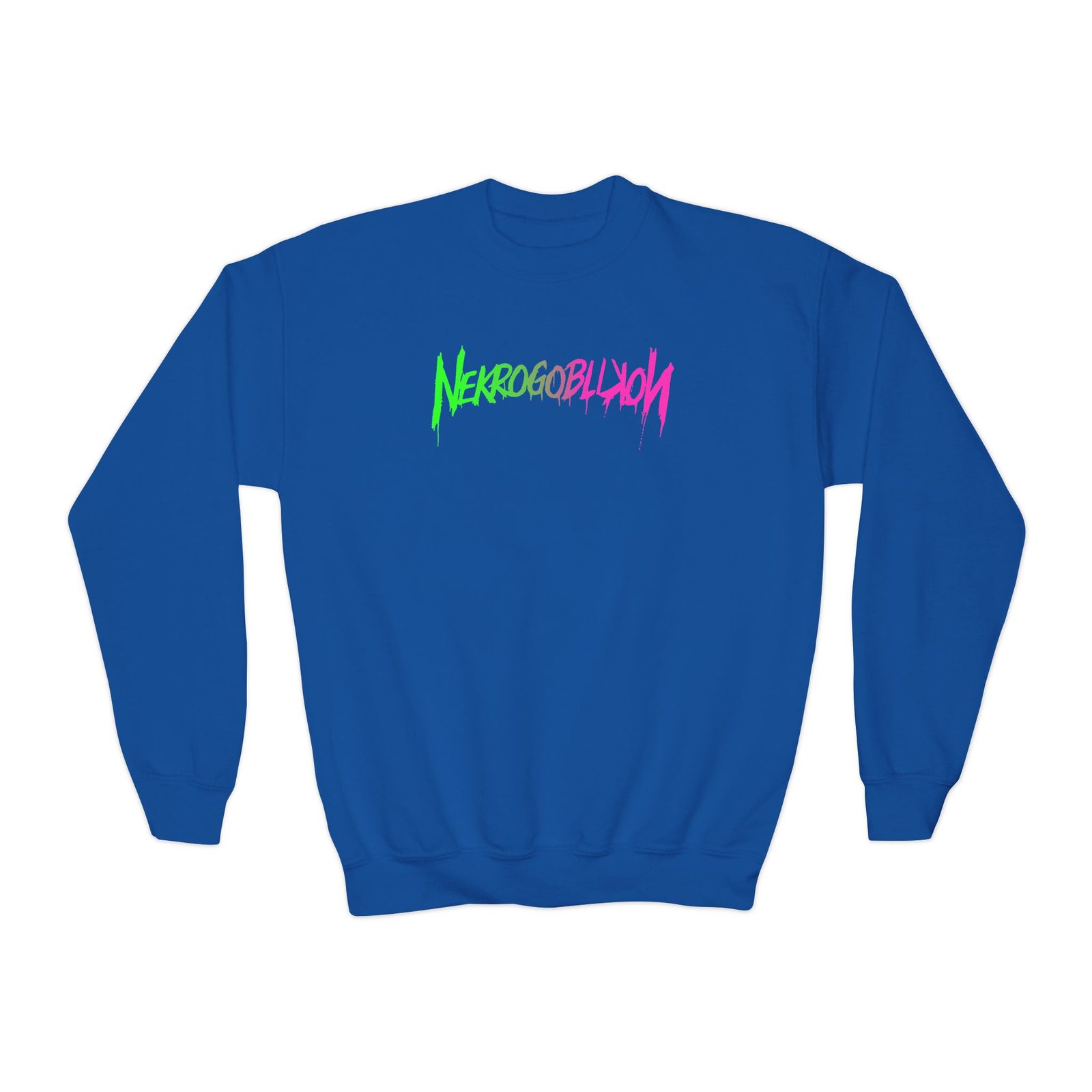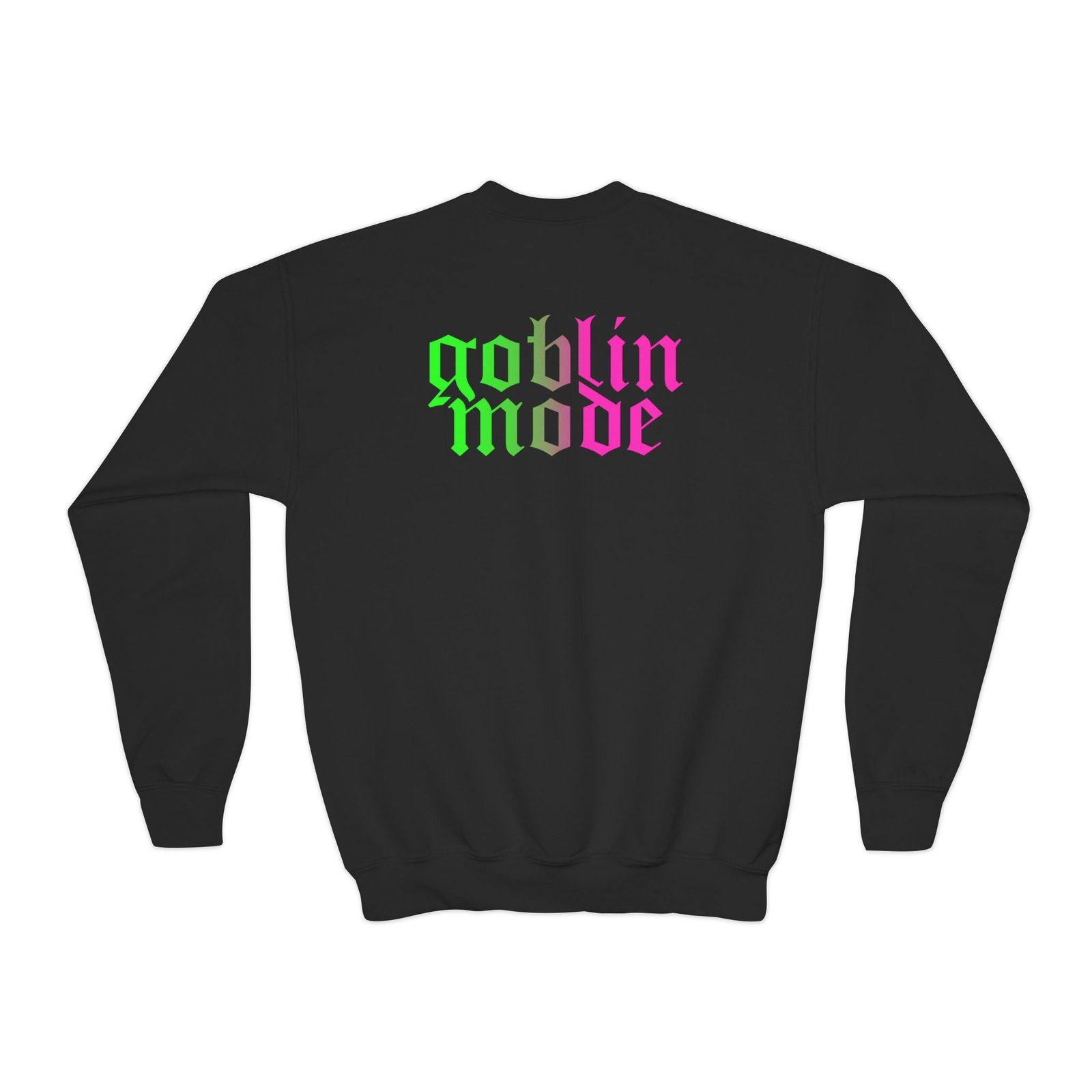 This loose-fit youth Nekrogoblikon Goblin Mode Wicked Ombre crewneck brings moody, occult-inspired style to everyday wear. A storm-lit silhouette and grainy, moonlit scene sit beneath hand-lettered gothic text in bruised purple — a look that reads like a midnight zine spread. The sweatshirt’s medium-heavy knit feels substantial without weighing down small frames, and the ribbed collar and cuffs hold their shape through play and repeat washes. Let this crew be the quiet centerpiece of a darker wardrobe: layered over band tees, hoodies, or under a denim jacket for a city-night vibe that leans mysterious and made-for-exploring.