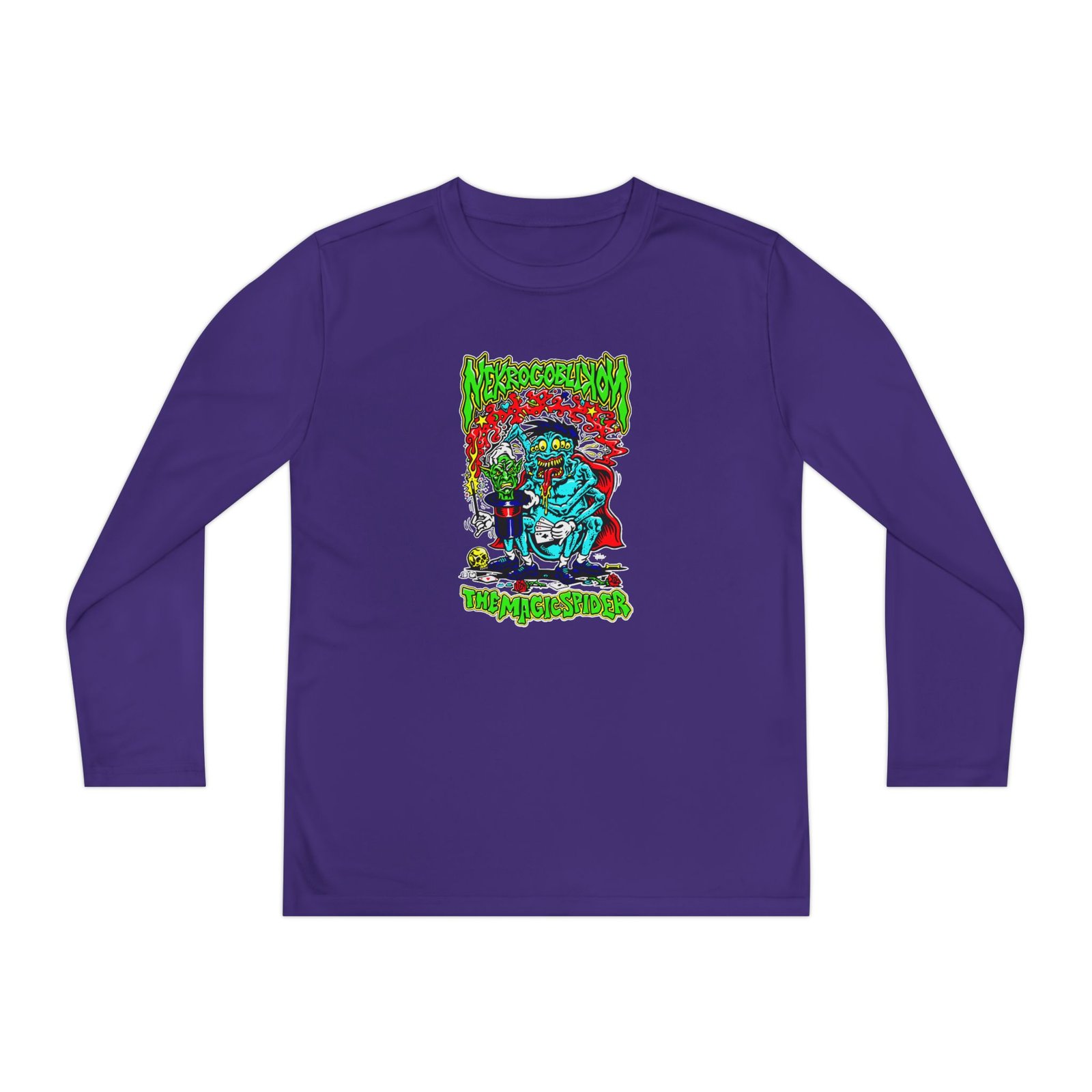 A lightweight Nekrogoblikon the Magicspider long-sleeve designed for active kids who lean into darker, atmospheric style. The shirt’s smooth, moisture-wicking polyester keeps movement unhindered and dries fast after practice or a day outside. The front art drops into a stormy, grayscale scene crowned by a jagged flash of lightning and moody gothic lettering — a bold, quietly rebellious statement that pairs with skate nights, band practice, or just hanging with friends. The athletic cut skims the body for an energetic silhouette, while the tear-away label keeps comfort high. Warmth is balanced with breathability, so it layers easily under a jacket or wears solo on cooler evenings.