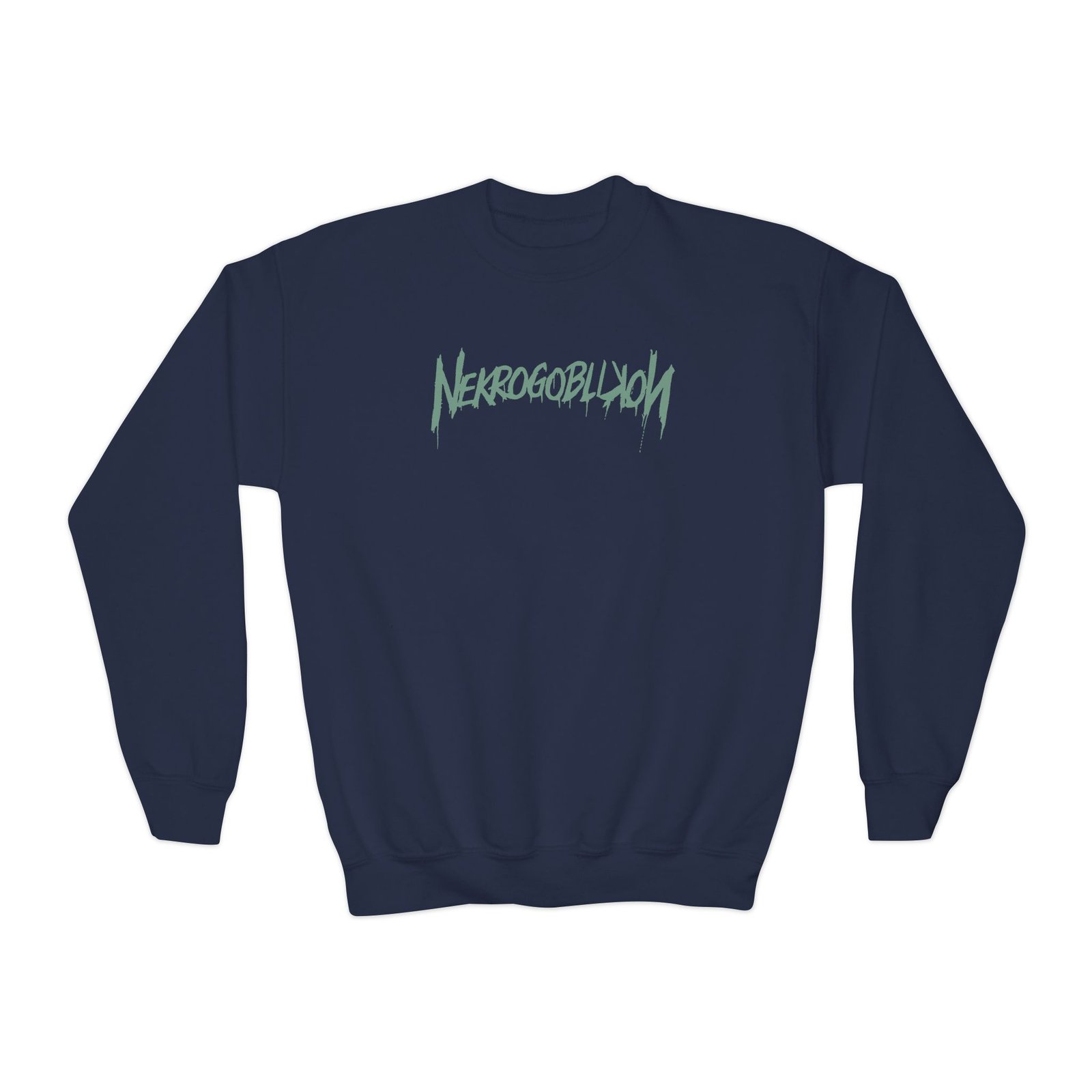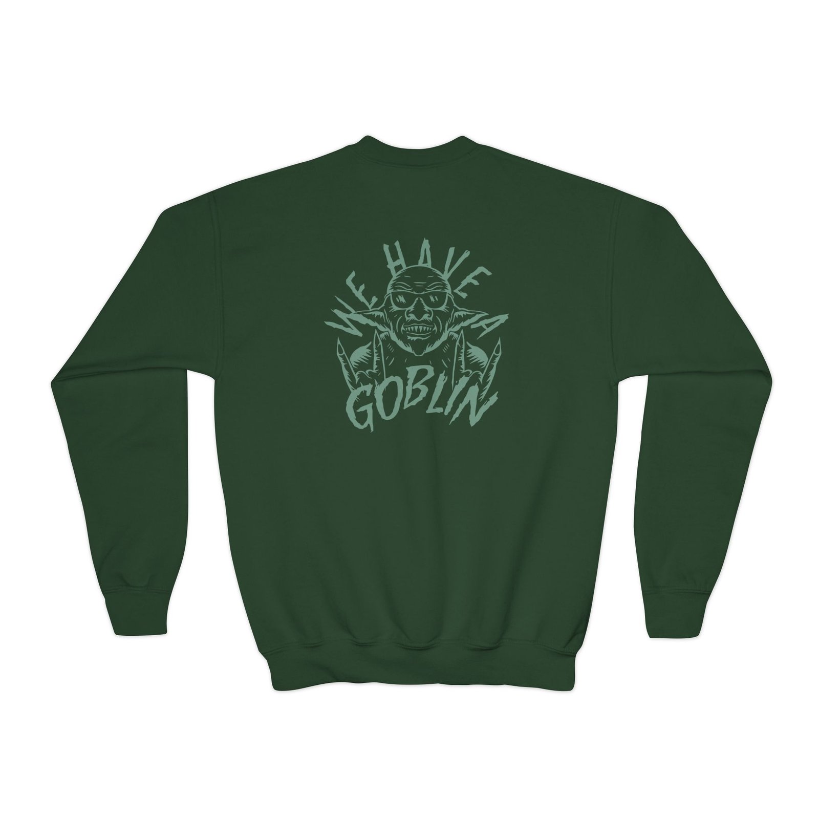 This loose-fit youth Nekrogoblikon We Have a Goblin crewneck brings moody, occult-inspired style to everyday wear. A storm-lit silhouette and grainy, moonlit scene sit beneath hand-lettered gothic text in bruised purple — a look that reads like a midnight zine spread. The sweatshirt’s medium-heavy knit feels substantial without weighing down small frames, and the ribbed collar and cuffs hold their shape through play and repeat washes. Let this crew be the quiet centerpiece of a darker wardrobe: layered over band tees, hoodies, or under a denim jacket for a city-night vibe that leans mysterious and made-for-exploring.