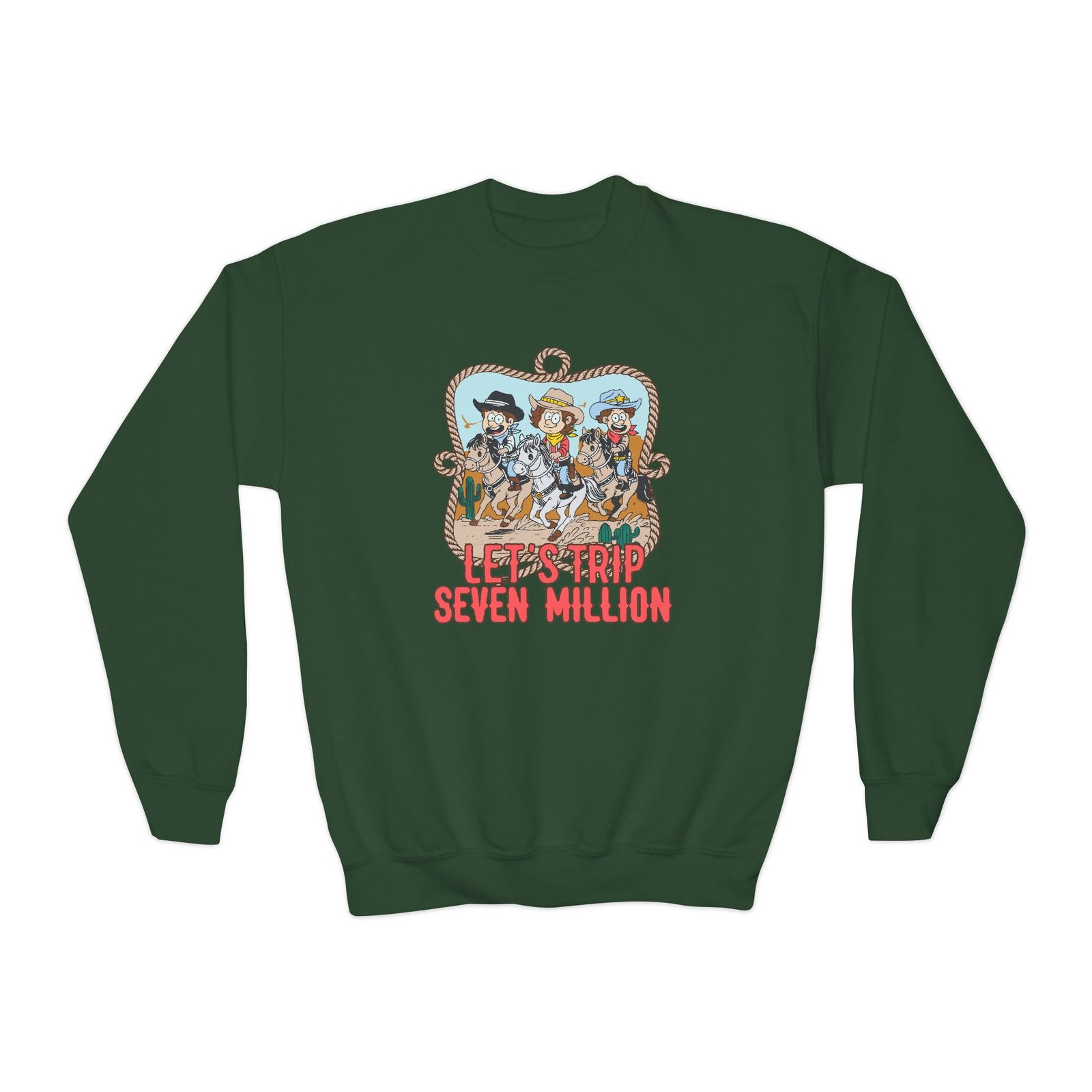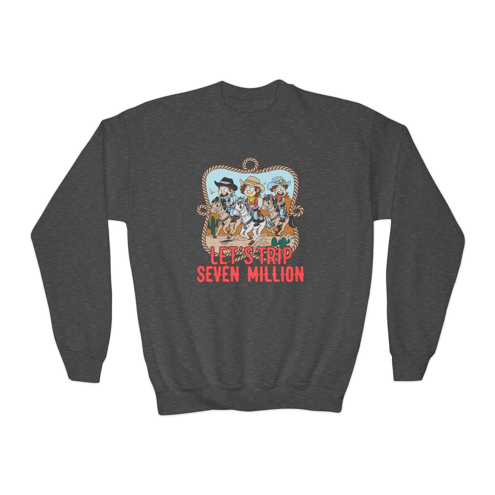This loose-fit youth Sturniolo Let's Trip Cowboy crewneck brings moody, occult-inspired style to everyday wear. A storm-lit silhouette and grainy, moonlit scene sit beneath hand-lettered gothic text in bruised purple — a look that reads like a midnight zine spread. The sweatshirt’s medium-heavy knit feels substantial without weighing down small frames, and the ribbed collar and cuffs hold their shape through play and repeat washes. Let this crew be the quiet centerpiece of a darker wardrobe: layered over band tees, hoodies, or under a denim jacket for a city-night vibe that leans mysterious and made-for-exploring.