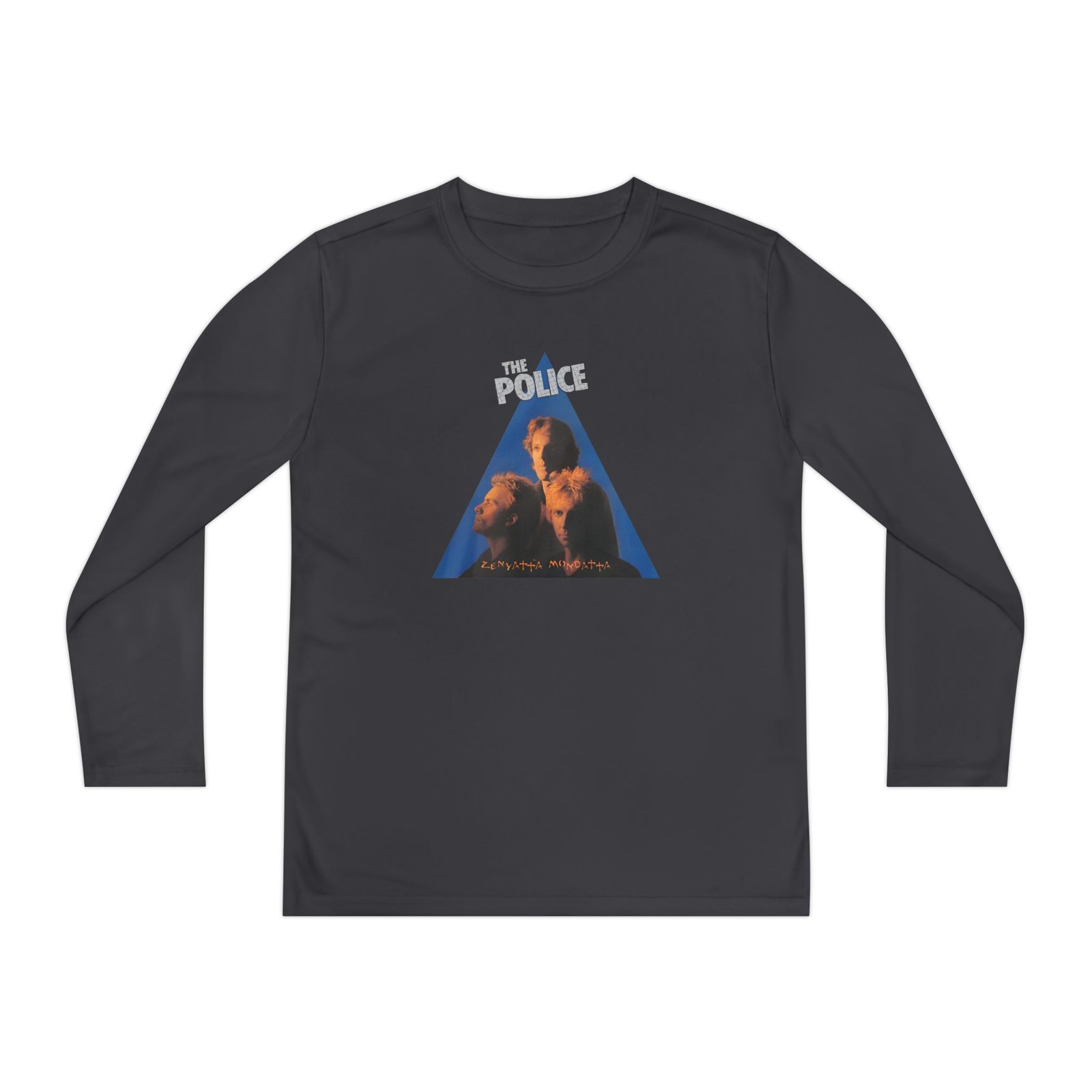 A lightweight The Police Zenyatta Mondatta long-sleeve designed for active kids who lean into darker, atmospheric style. The shirt’s smooth, moisture-wicking polyester keeps movement unhindered and dries fast after practice or a day outside. The front art drops into a stormy, grayscale scene crowned by a jagged flash of lightning and moody gothic lettering — a bold, quietly rebellious statement that pairs with skate nights, band practice, or just hanging with friends. The athletic cut skims the body for an energetic silhouette, while the tear-away label keeps comfort high. Warmth is balanced with breathability, so it layers easily under a jacket or wears solo on cooler evenings.